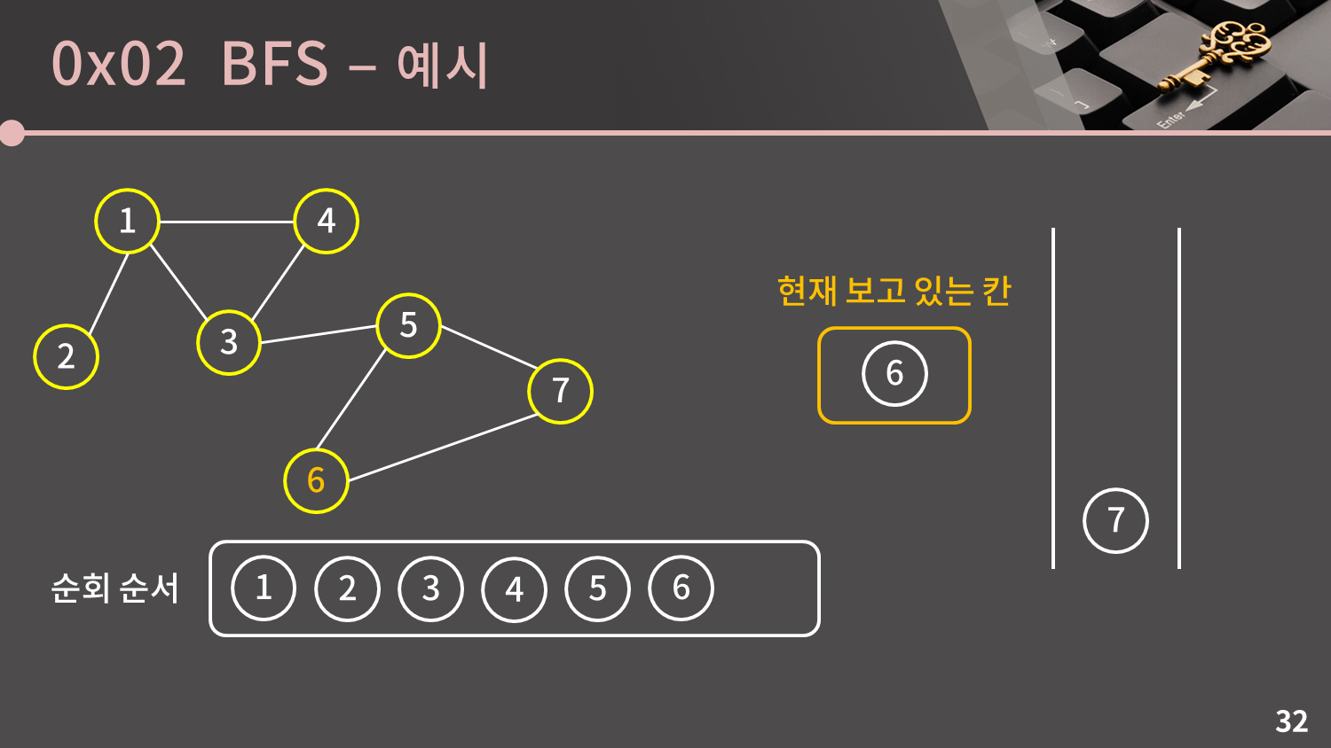 큐가 비어있지 않으므로 큐의 front인 6번 정점을 꺼냅니다. 6번 정점과 이웃한 5, 7번 정점은 이미 방문한 정점이므로 넘어갑니다.