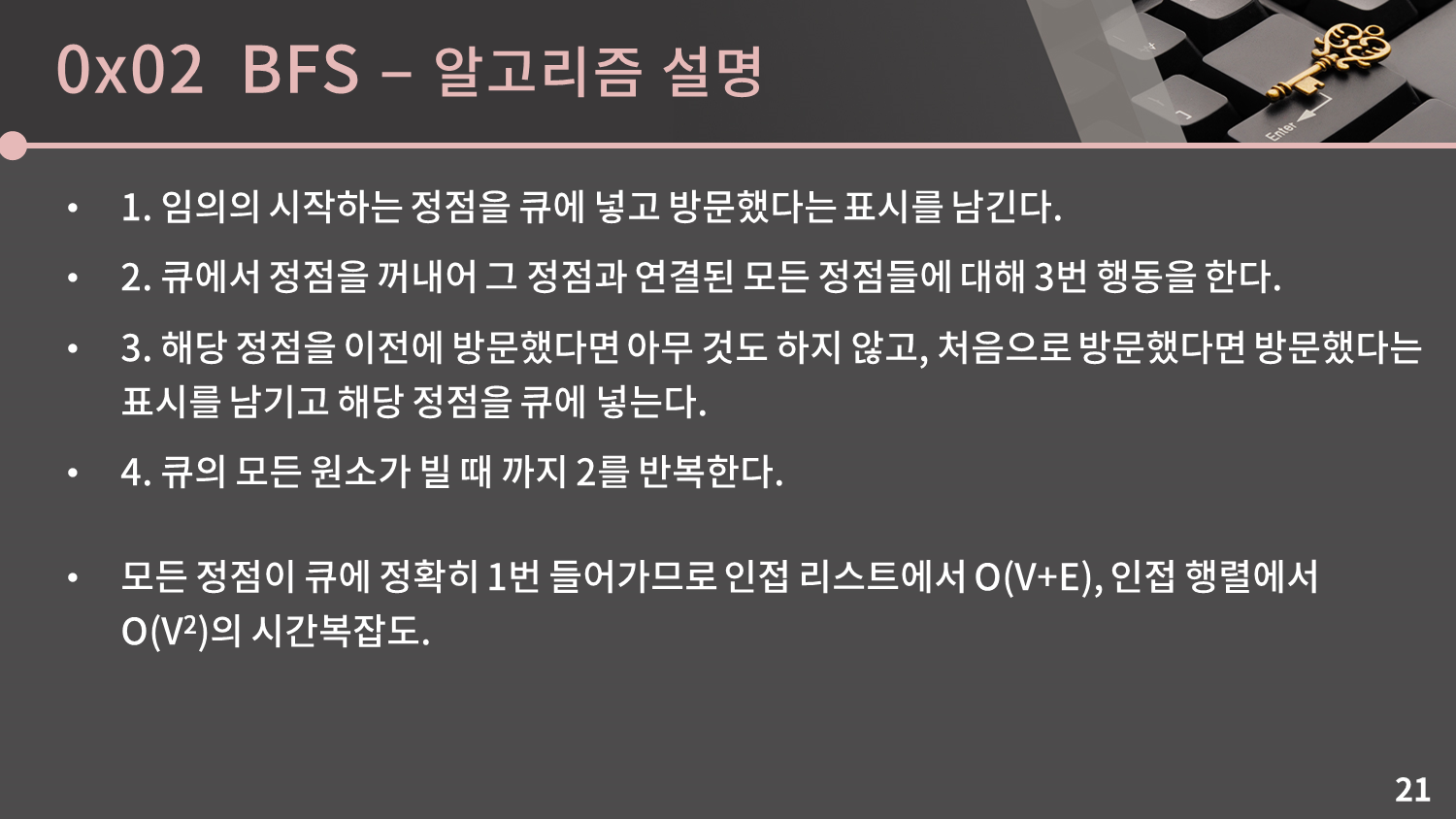 그러므로 앞에서 설명한 2번 “모든 정점들에 대해 그 정점과 연결된 모든 정점을 살펴보는 과정”은 $2E$ 혹은 $E$번의 탐색을 필요로 하고, 이로 인해 시간복잡도가 $O(V+E)$ 이 됩니다.
