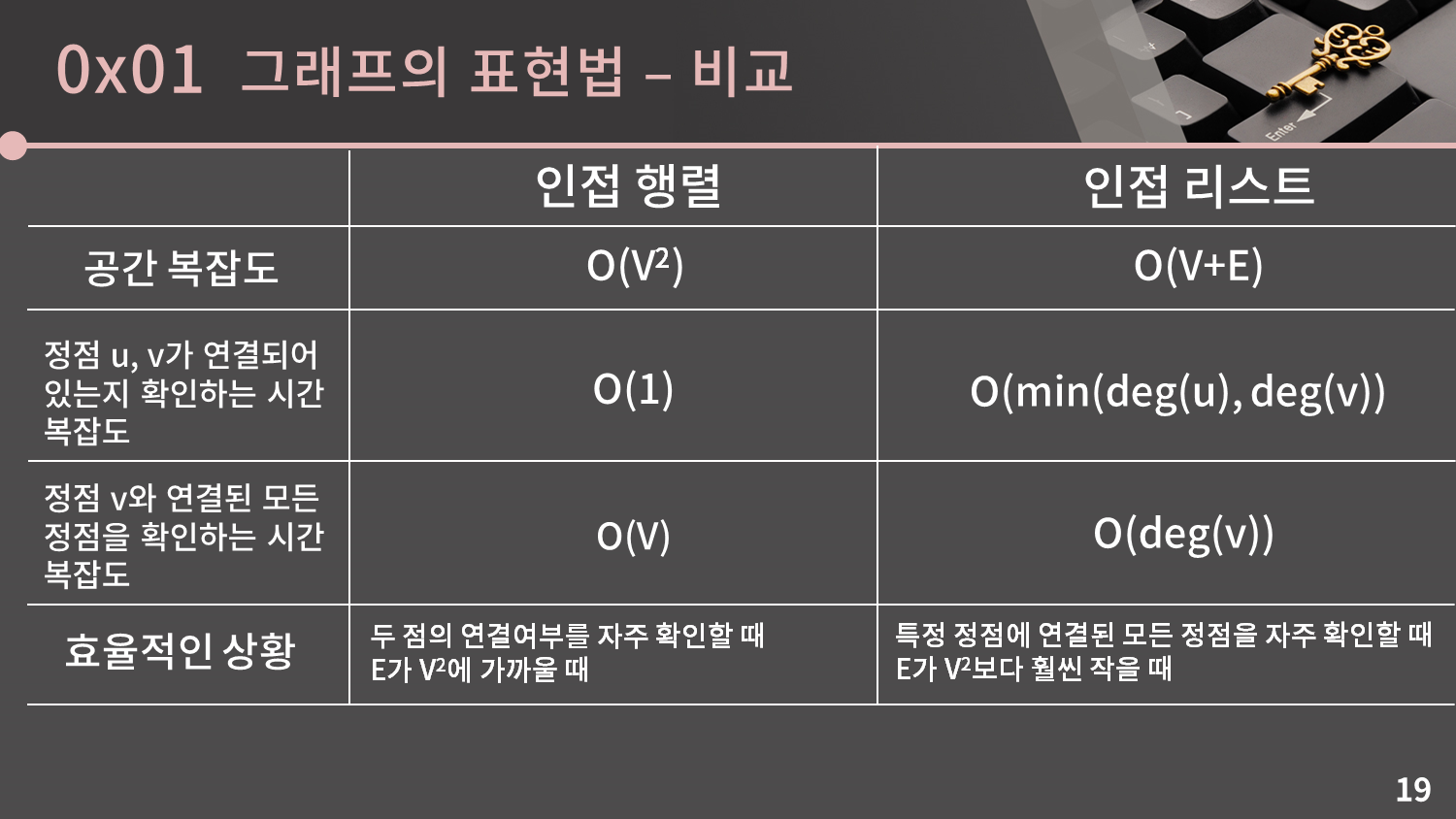 임의의 두 정점이 연결되어 있는지 확인하는 시간 복잡도의 경우, 인접 행렬은 그냥 adj_matrix[u][v]를 확인하면 되니 $O(1)$입니다. 인접 리스트에서는 한 정점에 대해 자신과 연결된 모든 정점을 확인해야 하는데, 둘 중에서 차수가 작은 것을 택해서 확인하는게 이득이므로 $O(min(deg(u), deg(v))$입니다.