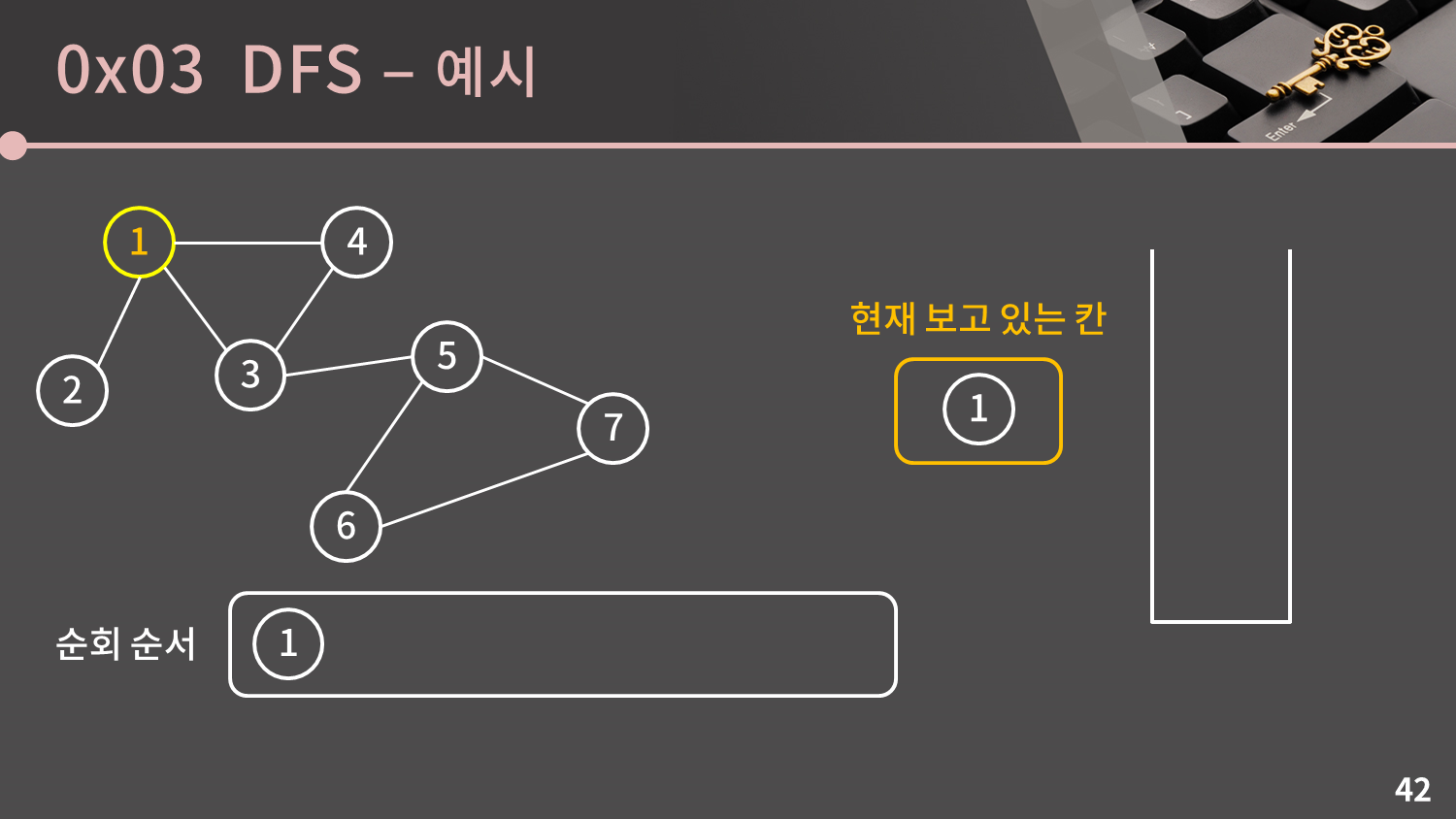스택가 비어있지 않으므로 스택의 top인 1번 정점을 꺼냅니다.