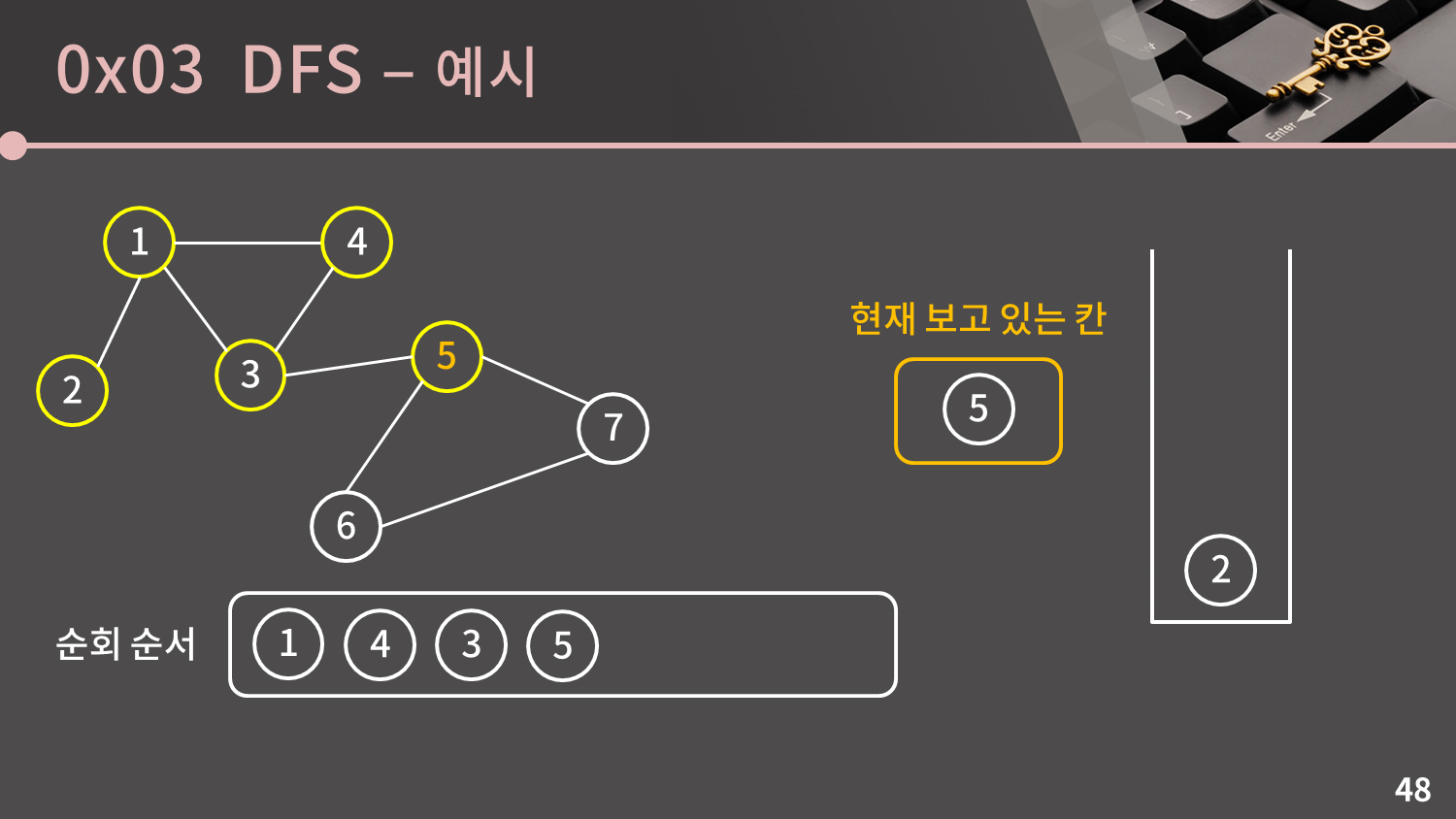 스택이 비어있지 않으므로 스택의 top인 5번 정점을 꺼냅니다.