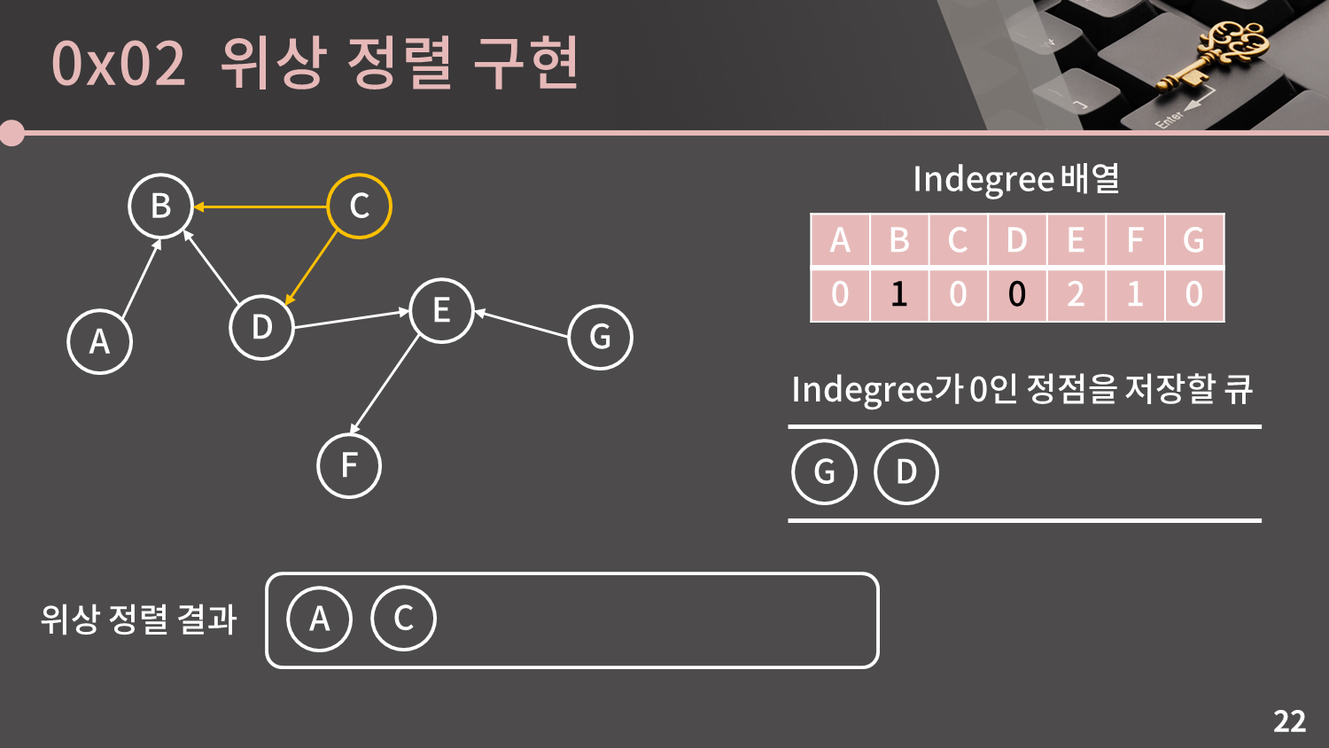 큐의 front에 있는 C를 가져와 위상 정렬 결과에 추가합니다. 정점 C를 "관념적으로" 지울 것이기 때문에 C로부터 연결된 정점 B, D의 Indegree가 1 감소합니다. 정점 B의 Indegree는 아직 0이 아니기 때문에 큐에 넣지 않습니다. 정점 D의 Indegree는 0이 되었기 때문에 큐에 추가해줍니다.