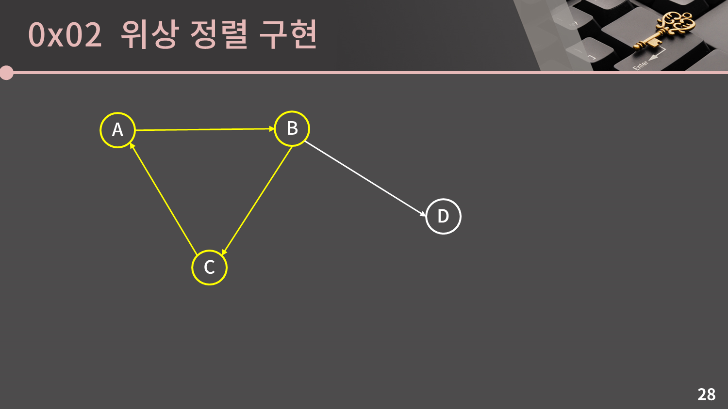그림을 재탕했는데요, 그림과 같이 ABC라는 사이클이 있을 경우 A, B, C는 어느 것도 Indegree가 0이 될 수 없습니다. A의 Indegree가 0이 되려면 B의 Indegree가 0이 되어 선택되어야 하는데, B의 Indegree가 0이 되려면 C의 Indegree가 0이 되어 선택되어야 하고, 정작 C의 Indegree가 0이 되려면 A의 Indegree가 0이 되어야 하기 때문에 A, B, C는 서로 물고 물려있기 때문입니다.