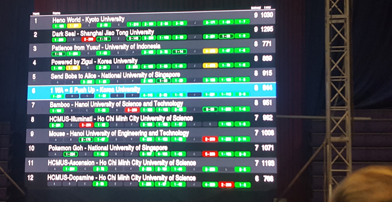 1 WA = 5 Push Up 은메달!! 8솔브 6등이었고 은메달을 획득했습니다. 한 학교당 최대 한 팀에게만 메달을 주어서 메달이나 상금은 따로 못받았습니다.