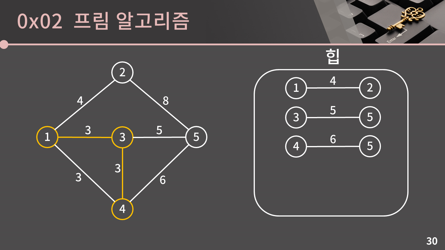 힙에 간선들을 적절히 넣어두면 매 순간마다 최소 신장 트리에 포함된 정점과 최소 신장 트리에 포함되지 않은 정점을 연결하는 간선 중에서 최소를 효율적으로 알아낼 수 있습니다.