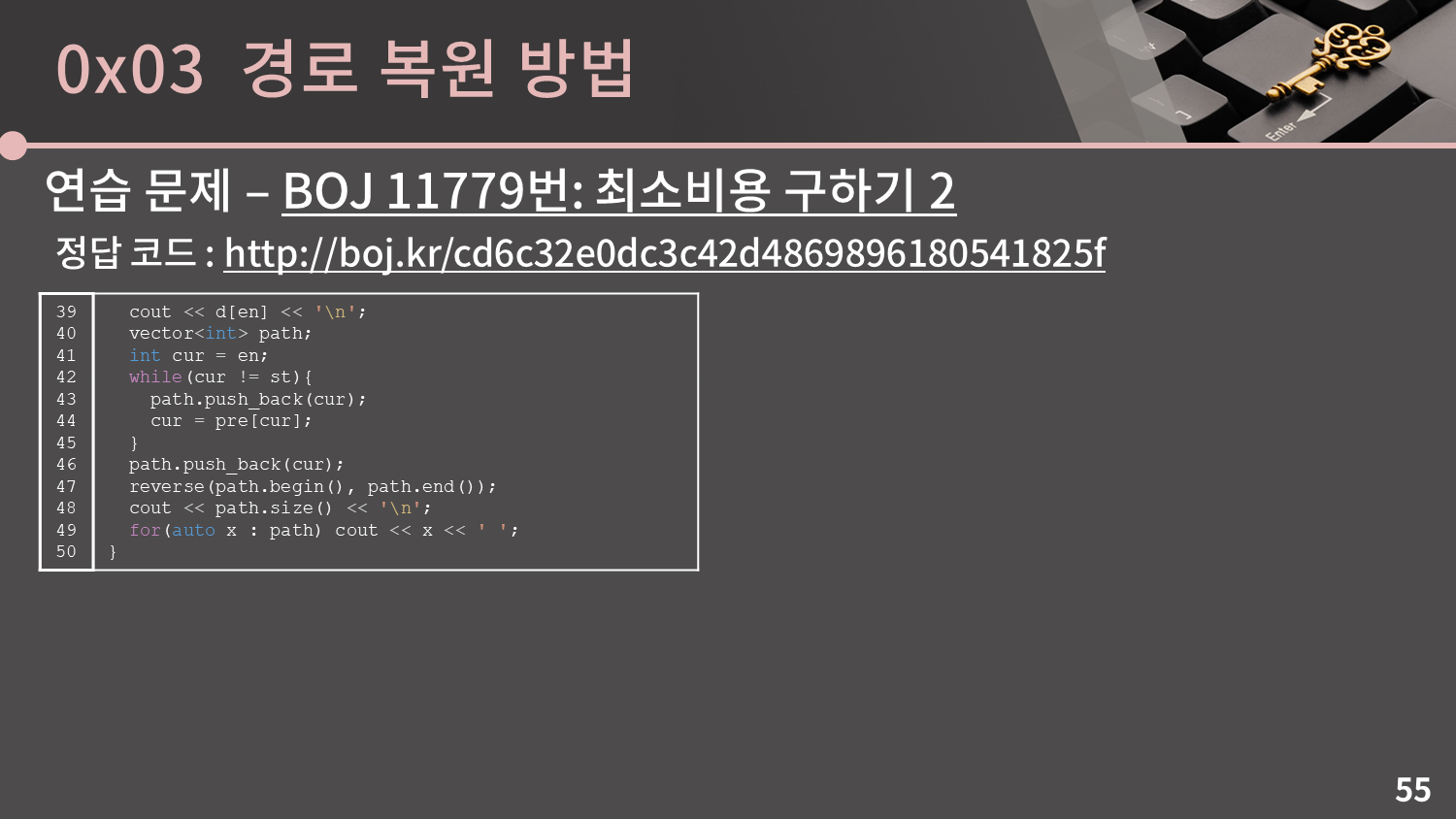 이전 문제에 썼던 코드에서 $pre$ 배열을 갱신하고, 이후 $pre$ 배열을 이용해 경로를 출력할 수 있도록 수정을 하면 됩니다. 주어지는 입력의 형식이 이전 문제와 약간 다르다는 점에 유의하세요. 직접 한 번 해보세요. 다음 슬라이드에는 정답 코드가 나와있습니다.