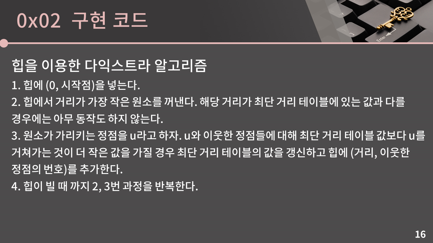 이제 힙을 이용한 다익스트라 알고리즘의 구현을 소개해드리겠습니다. 일단 방법은