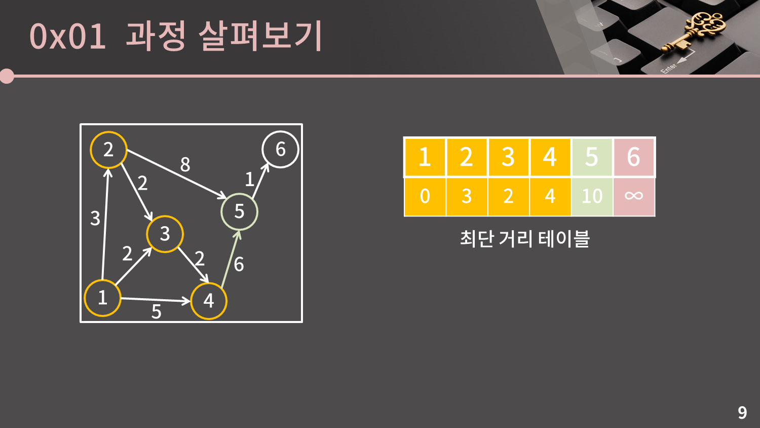 주황색은 시작점으로부터의 거리가 확정된 정점을, 초록색은 이번에 확정된 정점으로부터 들어오는 간선이 있어 최단거리가 변경될 수 있는 정점을 의미합니다.