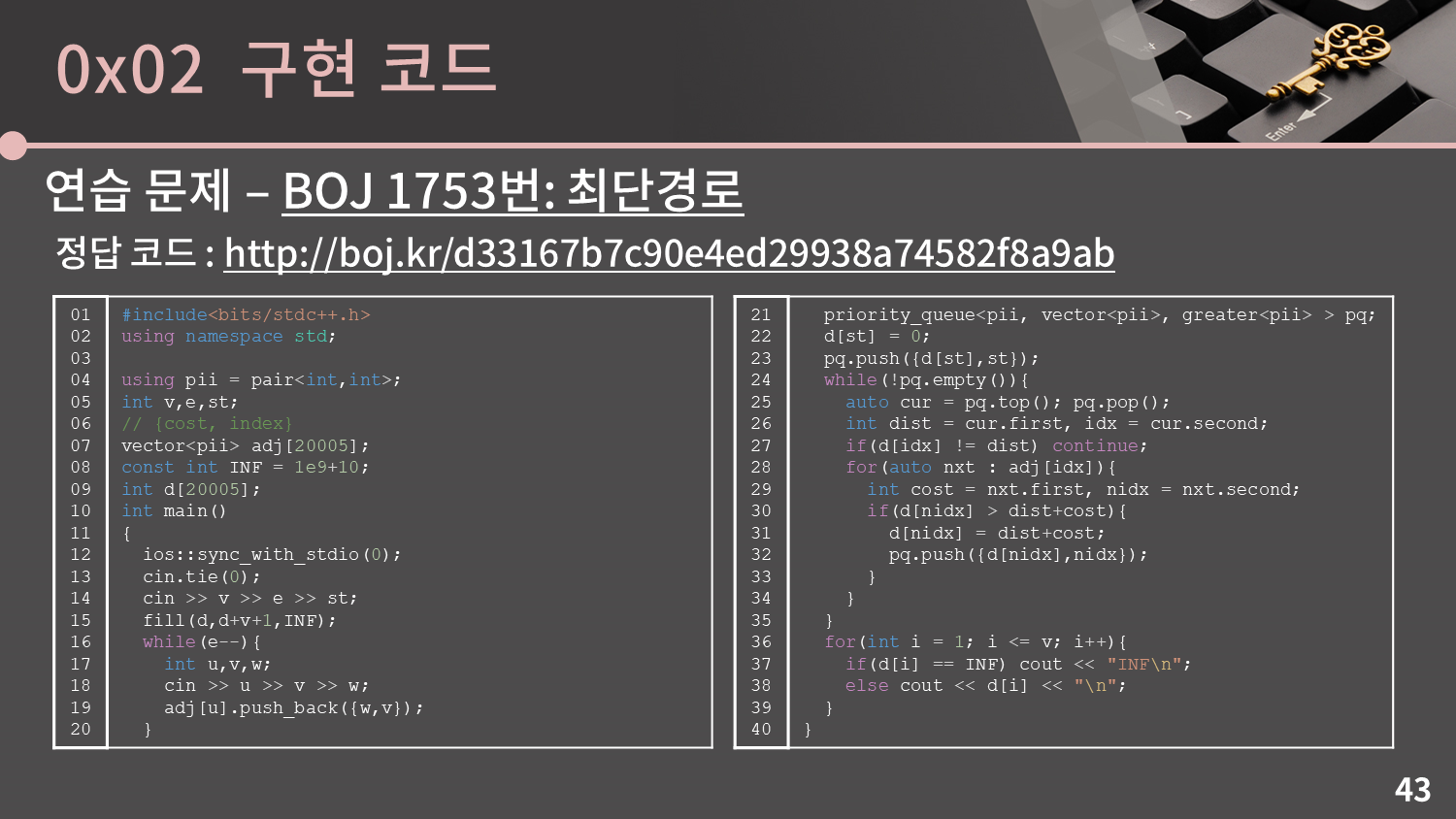 BOJ 1753번: 최단경로 문제를 풀어봅시다. 다음 슬라이드에 정답 코드가 나옵니다.