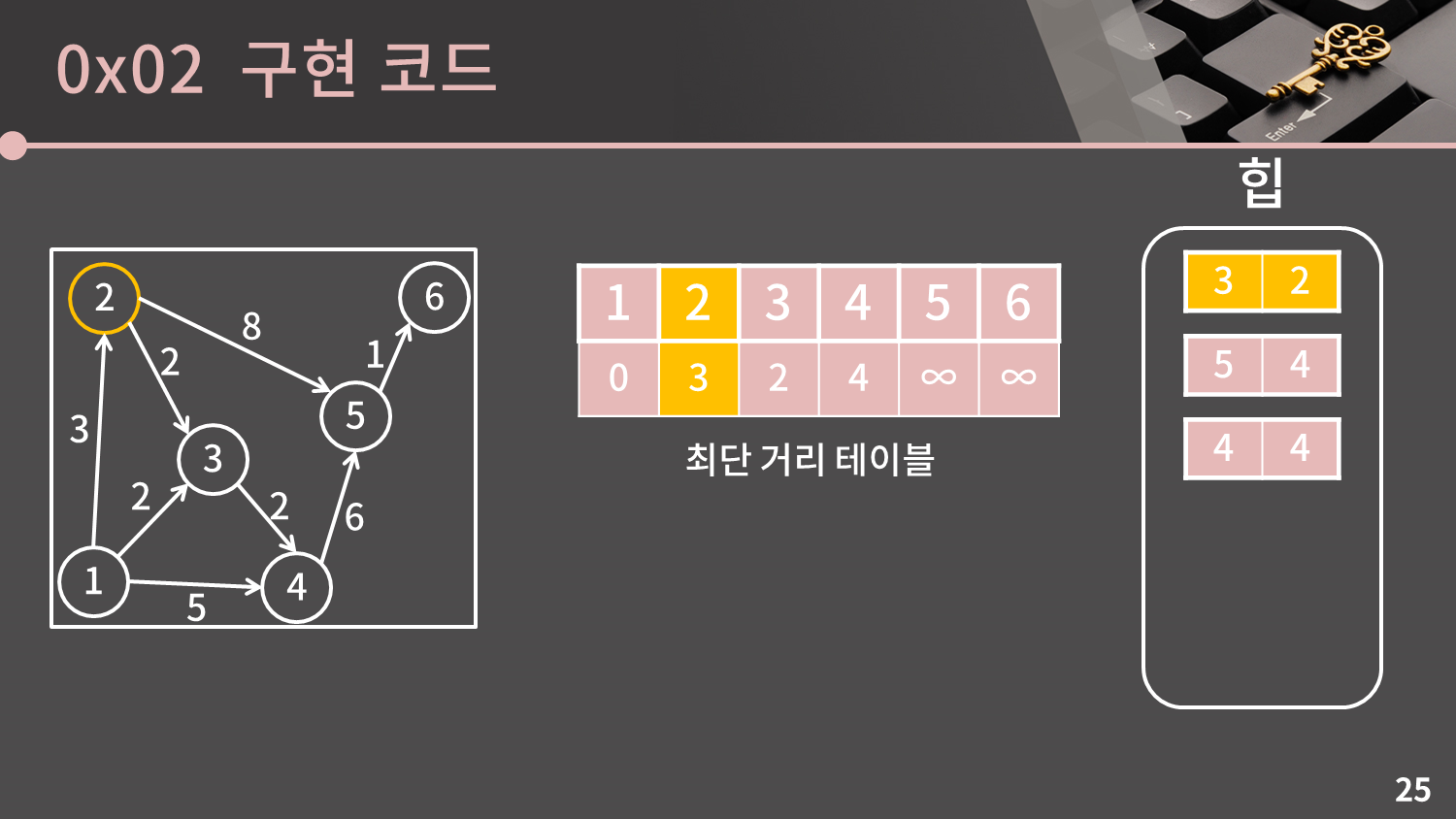 지금 (2, 3), (3, 2)가 조금 혼동을 줄 수 있을 것 같은데 왼쪽이 거리고 오른쪽이 정점의 번호입니다. 즉 힙의 2번째 원소는 거리가 2이고 3번 정점에 관한 원소라는 의미입니다. 헷갈리지 마세요.