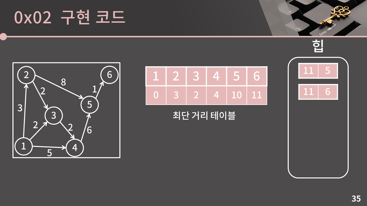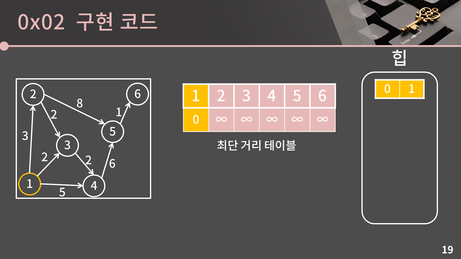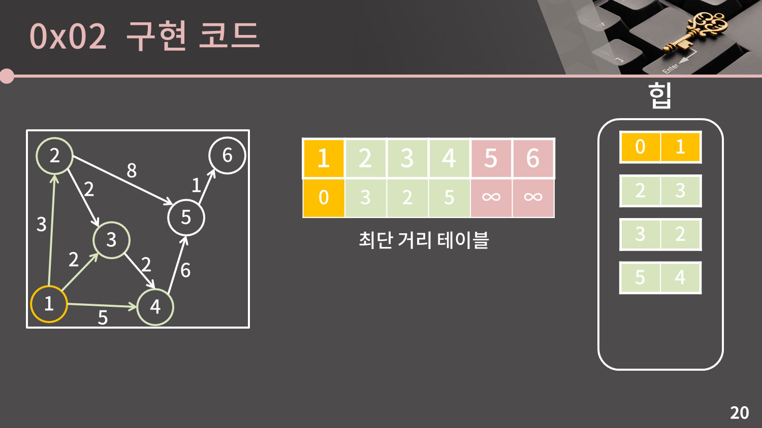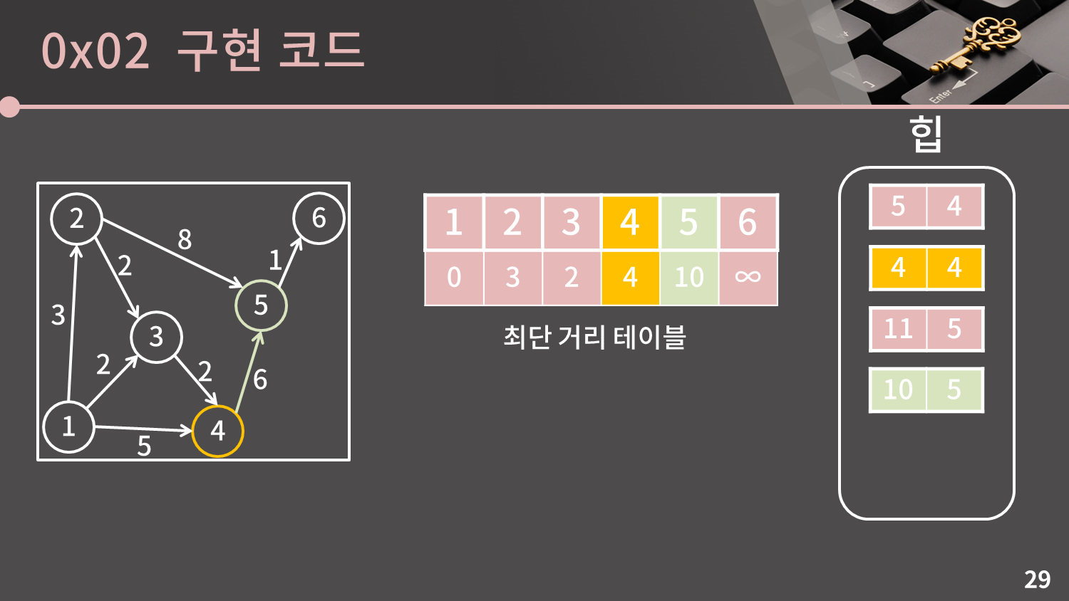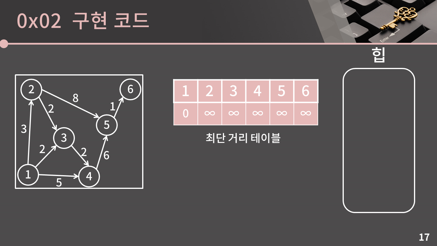 이제 힙을 이용한 다익스트라 알고리즘의 구현을 소개해드리겠습니다. 개념이 크게 어렵지 않다면 바로 코드를 보여드리면서 설명드릴텐데, 어려워할 것 같아 구현에 초점을 맞춰 다시 과정을 따라가보겠습니다.