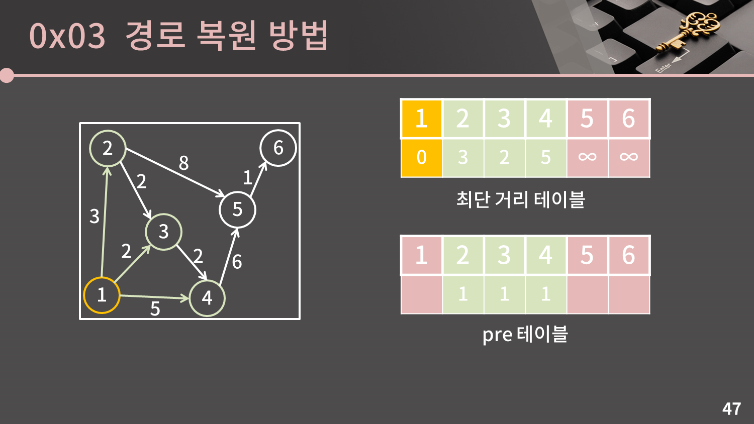 이 테이블은 시작점에서 나에게로 올 때 직전에 어디를 방문했는지 기록하는 테이블이므로 $pre$ 테이블이라고 쓰겠습니다.