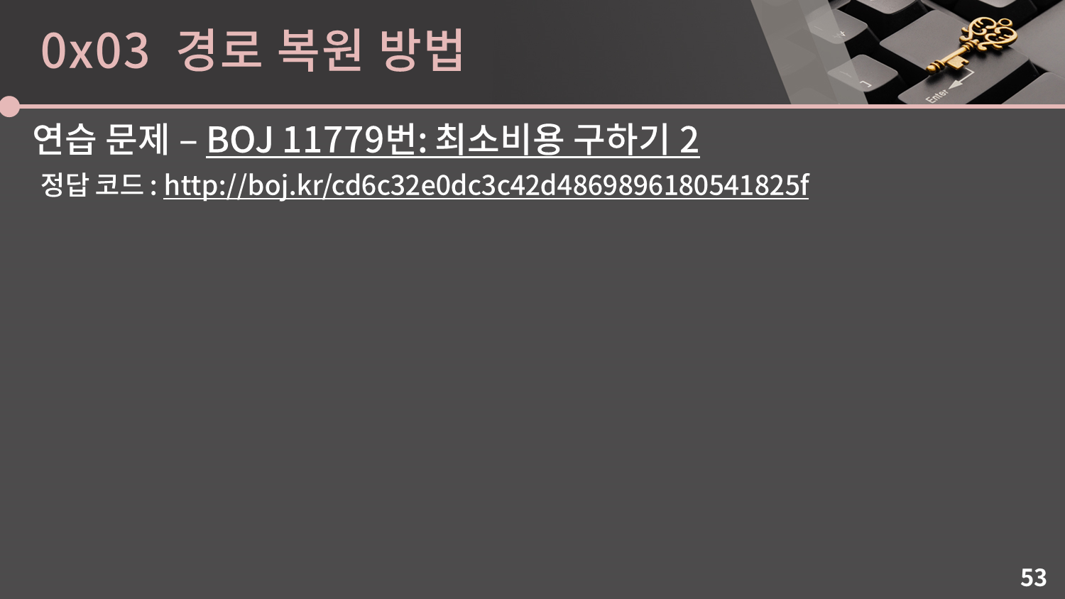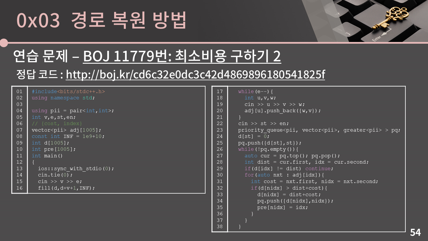 이전 문제에 썼던 코드에서 $pre$ 배열을 갱신하고, 이후 $pre$ 배열을 이용해 경로를 출력할 수 있도록 수정을 하면 됩니다. 주어지는 입력의 형식이 이전 문제와 약간 다르다는 점에 유의하세요. 직접 한 번 해보세요. 다음 슬라이드에는 정답 코드가 나와있습니다.