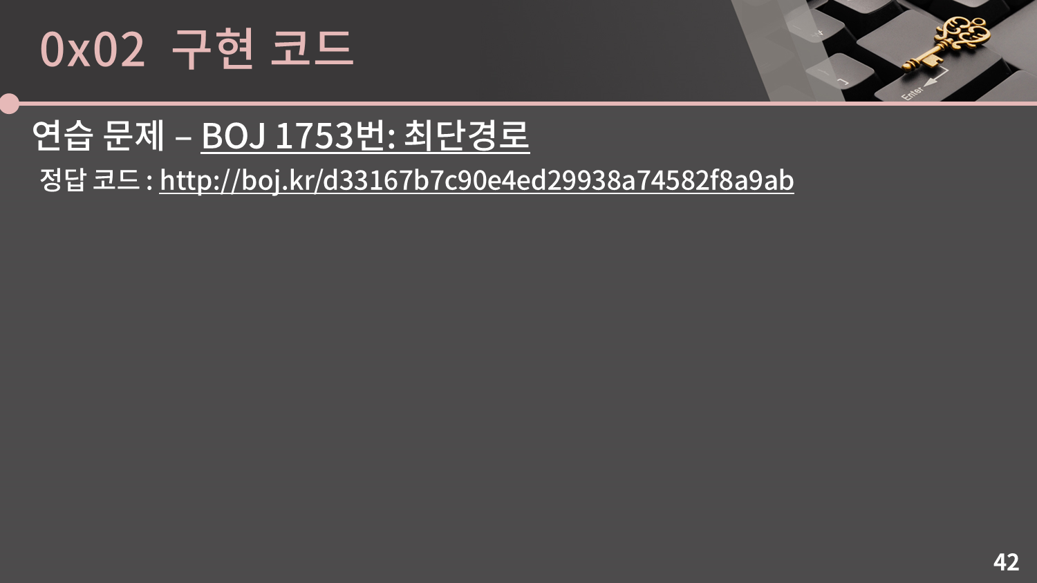 BOJ 1753번: 최단경로 문제를 풀어봅시다. 다음 슬라이드에 정답 코드가 나옵니다.