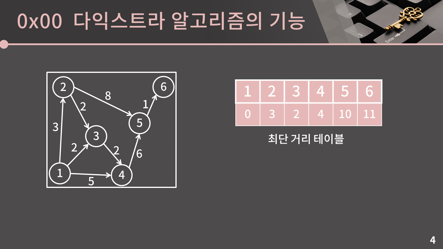 현재 4, 5, 6번 정점이 남아있습니다. 이 중에서 시작점으로부터 가장 가까운 점은 거리가 4인 4번 정점입니다. 4번 정점까지의 거리는 4로 확정됩니다.