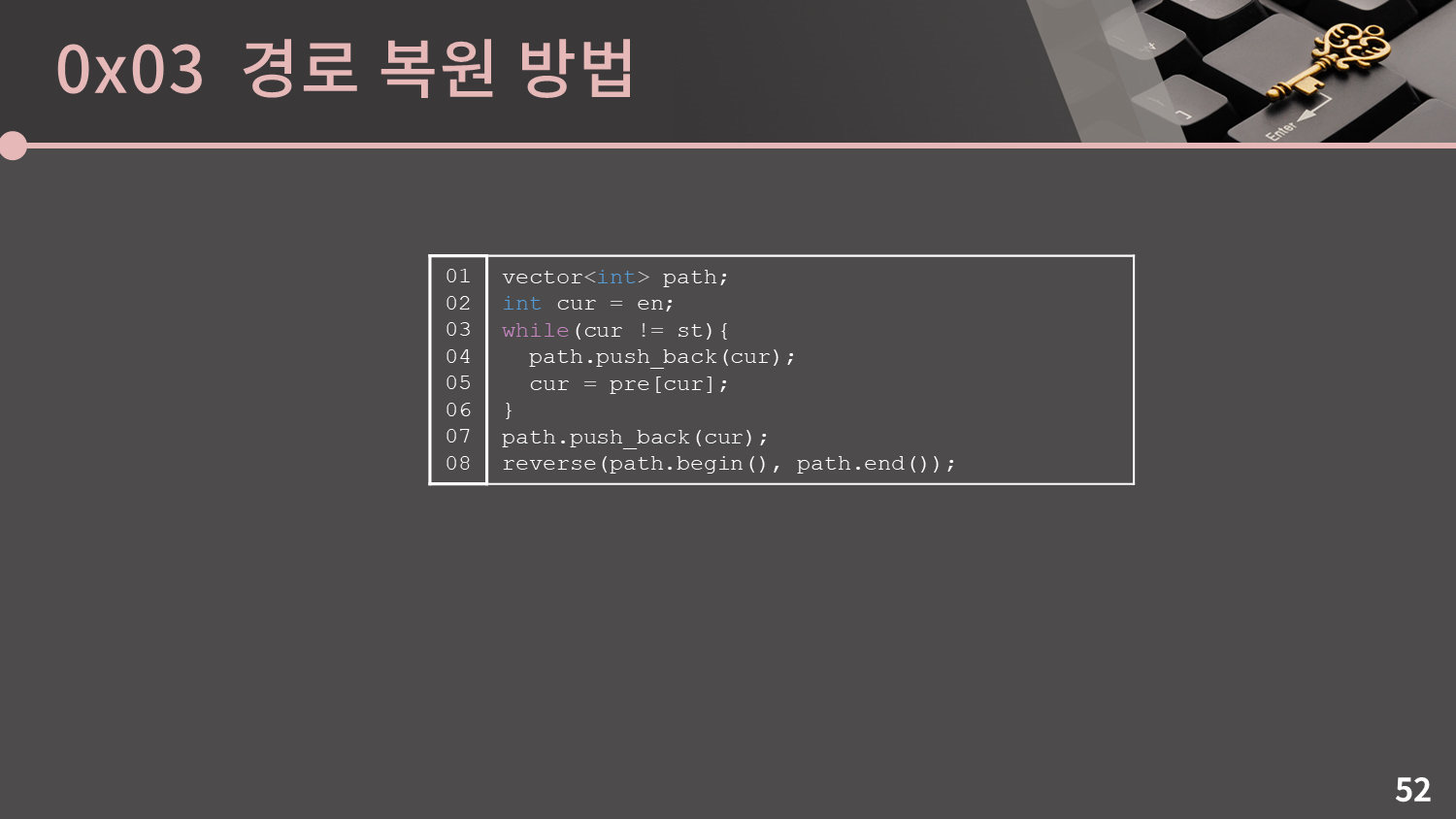 이렇게 $pre$ 테이블을 다 채운 뒤에는 시작점에서 $t$로 가는 경로를 복원하는 것을 어렵지 않게 구현할 수 있을 것입니다. $cur$ 변수가 $t$에서 시작해 시작점까지 $pre$를 계속 타고 가며 $path$ vector에 계속 push_back을 해주다가 마지막에 reverse를 하면 됩니다.