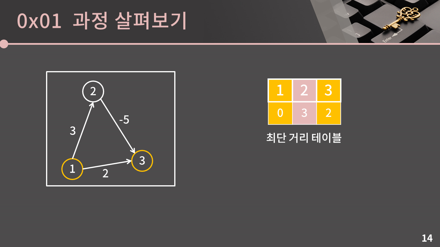 그런데 뭔가 이상합니다. 1 -> 2 -> 3이라는 경로를 따라가면 $3+(-5)=-2$ 만에 정점 3에 도달할 수 있는데 최단 거리 테이블에는 2라고 되어있습니다. 즉 잘못된 답을 냈네요.