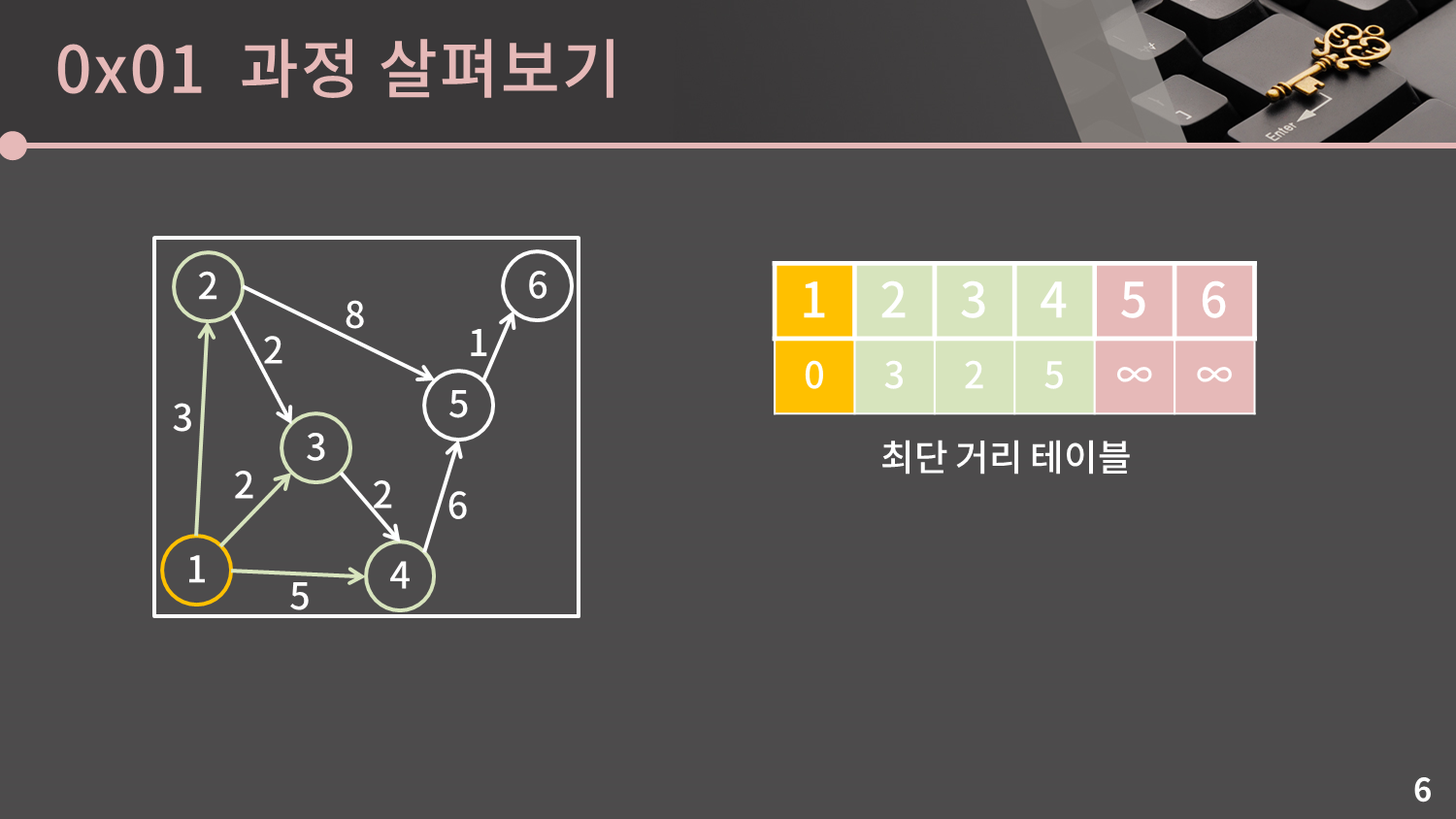 6에서 다른 정점으로 가는 간선은 존재하지 않으므로 따로 처리를 해줄 것이 없습니다.