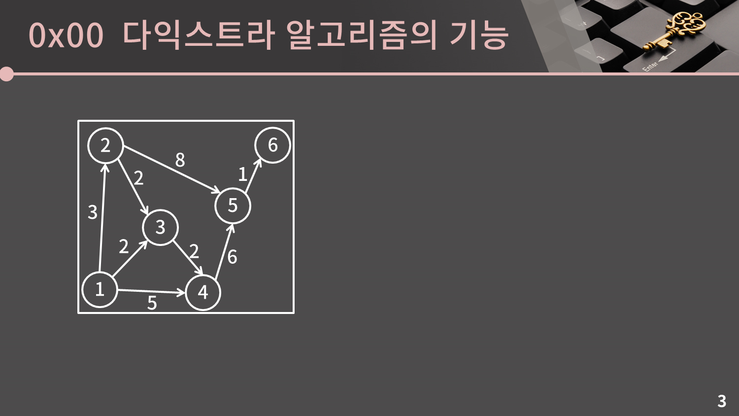 현재 2, 4, 5, 6번 정점이 남아있습니다. 이 중에서 시작점으로부터 가장 가까운 점은 거리가 3인 2번 정점입니다. 2번 정점까지의 거리는 3으로 확정됩니다.