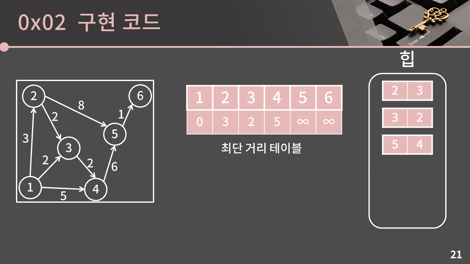 지금 (2, 3), (3, 2)가 조금 혼동을 줄 수 있을 것 같은데 왼쪽이 거리고 오른쪽이 정점의 번호입니다. 즉 힙의 2번째 원소는 거리가 2이고 3번 정점에 관한 원소라는 의미입니다. 헷갈리지 마세요.