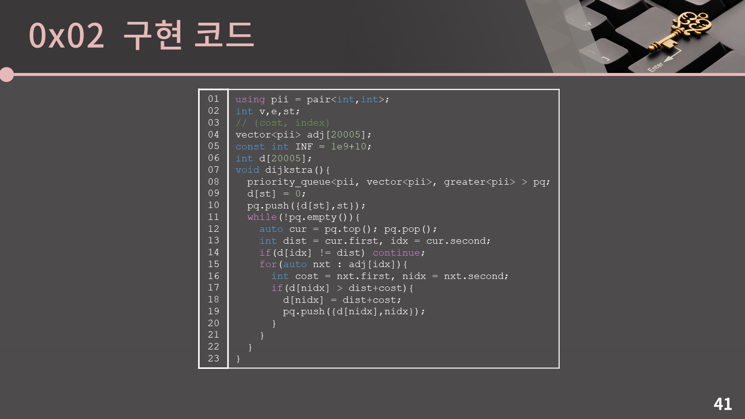 이것이 다익스트라 알고리즘의 코드입니다. $st$는 시작 정점의 번호를 의미합니다.