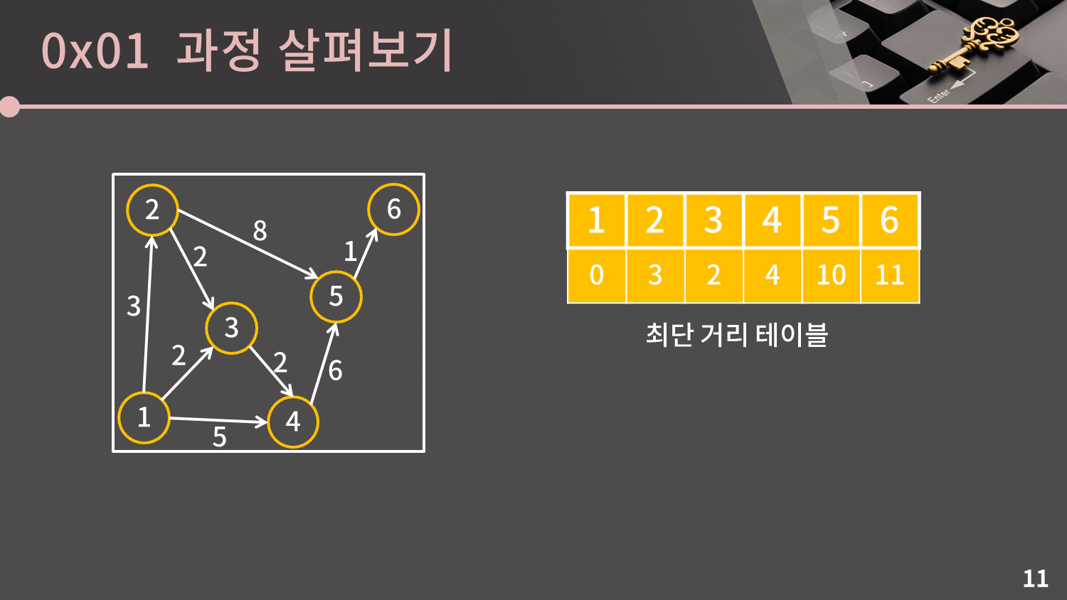 일단 시작점과 5번 정점의 거리는 10이고, 5번 정점에서 6번 정점으로 갈 수 있기 때문에 5번 정점을 거쳐서 6번 정점으로 갈 때의 최단 거리는 4번 정점까지의 거리와 간선의 가중치를 합쳐 $10+1=11$이 됩니다. 이 값과 기존에 저장된 값 중 작은 것을 최단 거리 테이블에 쓰면 됩니다. 기존에는 5번 정점까지의 최단 거리가 ∞으로 저장되어 있었으므로 이를 11로 갱신합니다.