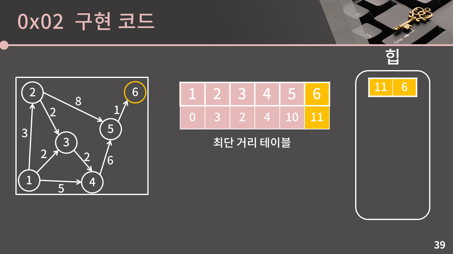 힙이 비어있지 않으므로 힙에서 가장 거리가 작은 원소를 선택합니다. 지금 힙에서는 (11, 6)가 선택될 것입니다. 우선 $d[6] = 11$이 맞는지 확인합니다. 일치하므로 과정을 이어갑니다.