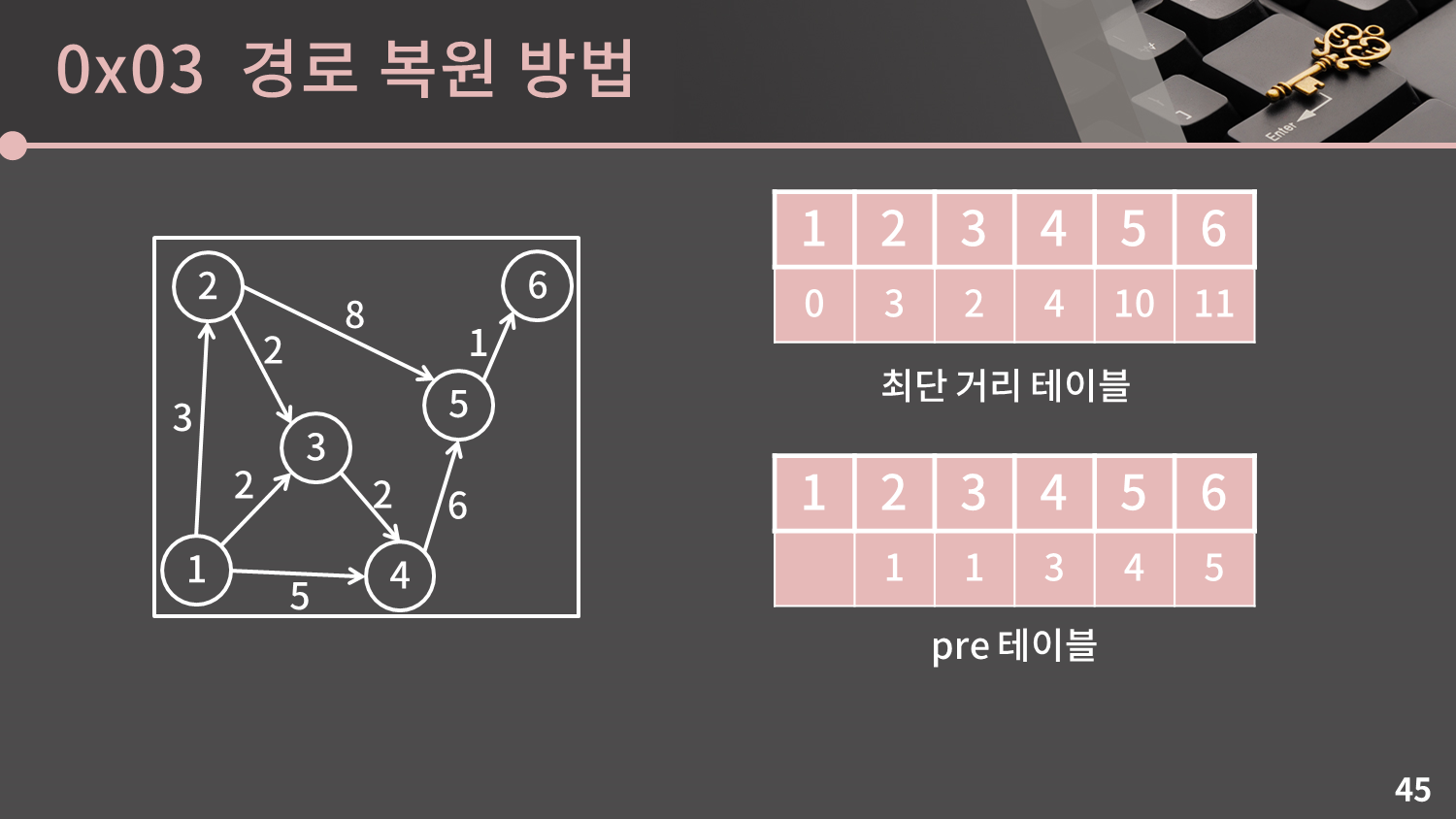 4번 정점이 선택되어 5번 정점의 최단 거리 값이 변경될 때 $pre[5]$에는 4가 기록됩니다.