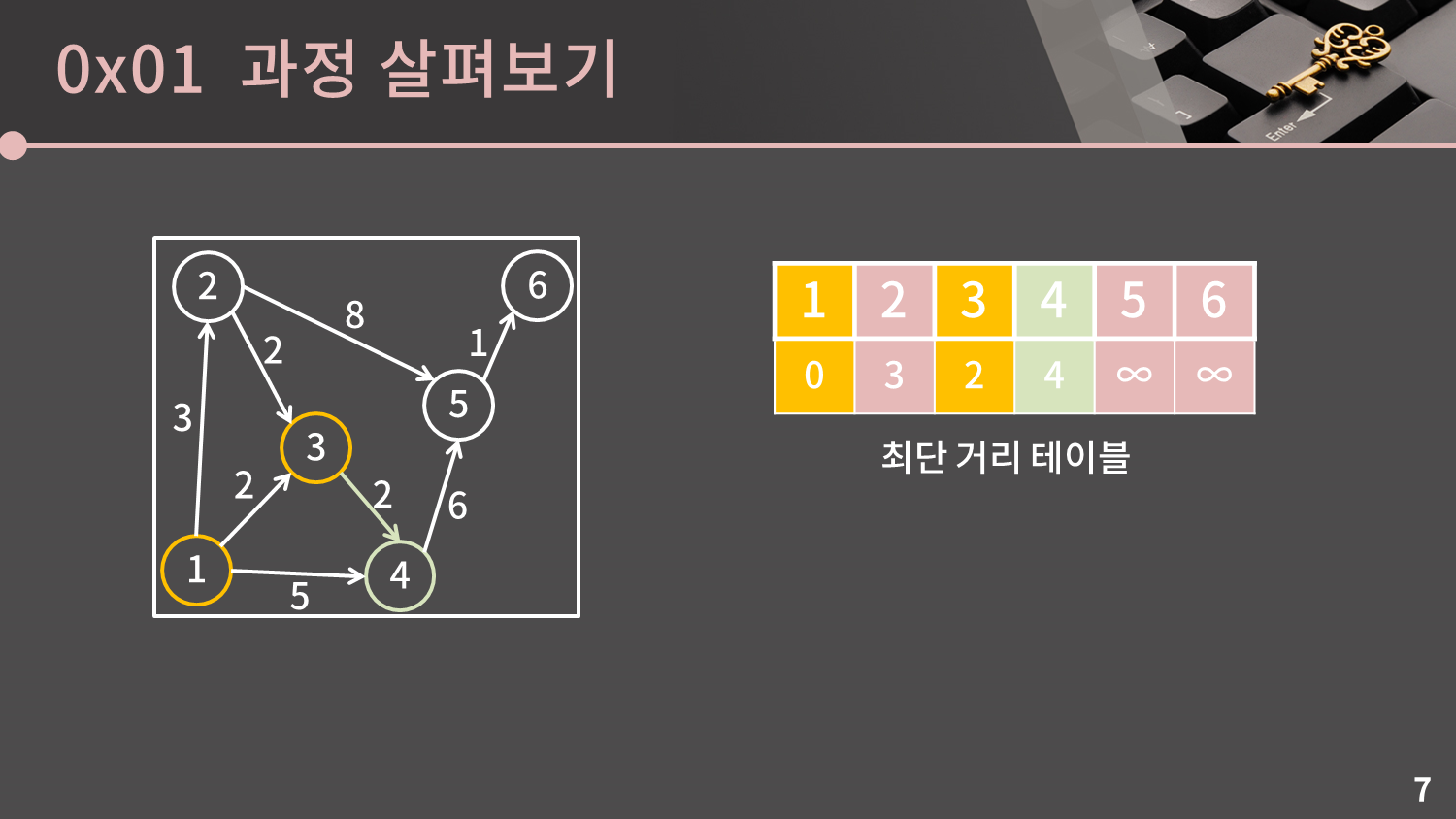 주황색은 시작점으로부터의 거리가 확정된 정점을, 초록색은 이번에 확정된 정점으로부터 들어오는 간선이 있어 최단거리가 변경될 수 있는 정점을 의미합니다.