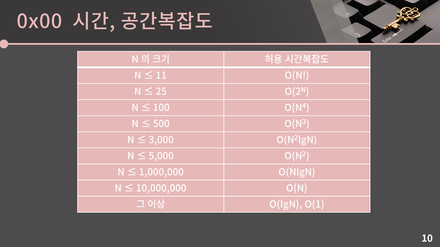 이런 식으로 N의 크기에 따른 허용 시간복잡도를 표로 나타낸 게 본문에 있는 표입니다. 물론 이 기준이 절대적인건 아닙니다. N이 10,000인데도 O(N²)이 통과될 수 있고, 반대로 복잡한 연산이 많은 경우 N이 1,000,000인데도 O(NlgN)이 통과되지 않을 수도 있습니다. 그냥 표를 통해 대략적인 느낌만 가져가시면 됩니다.