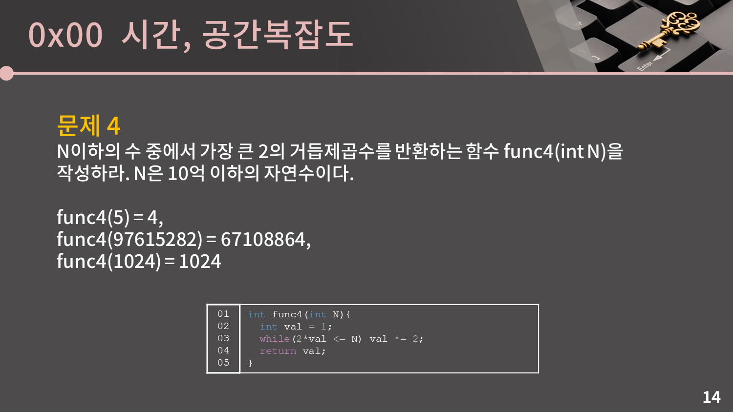 이제 마지막 문제입니다. 마지막 문제는 N이하의 수 중에서 가장 큰 2의 거듭제곱수를 반환하는 문제입니다. 예를 들어 N이 5라고 할 때 5이하의 수 중에서 2의 거듭제곱수는 1, 2, 4가 있는데 셋 중에서 4가 가장 크니 4를 반환하게 됩니다.