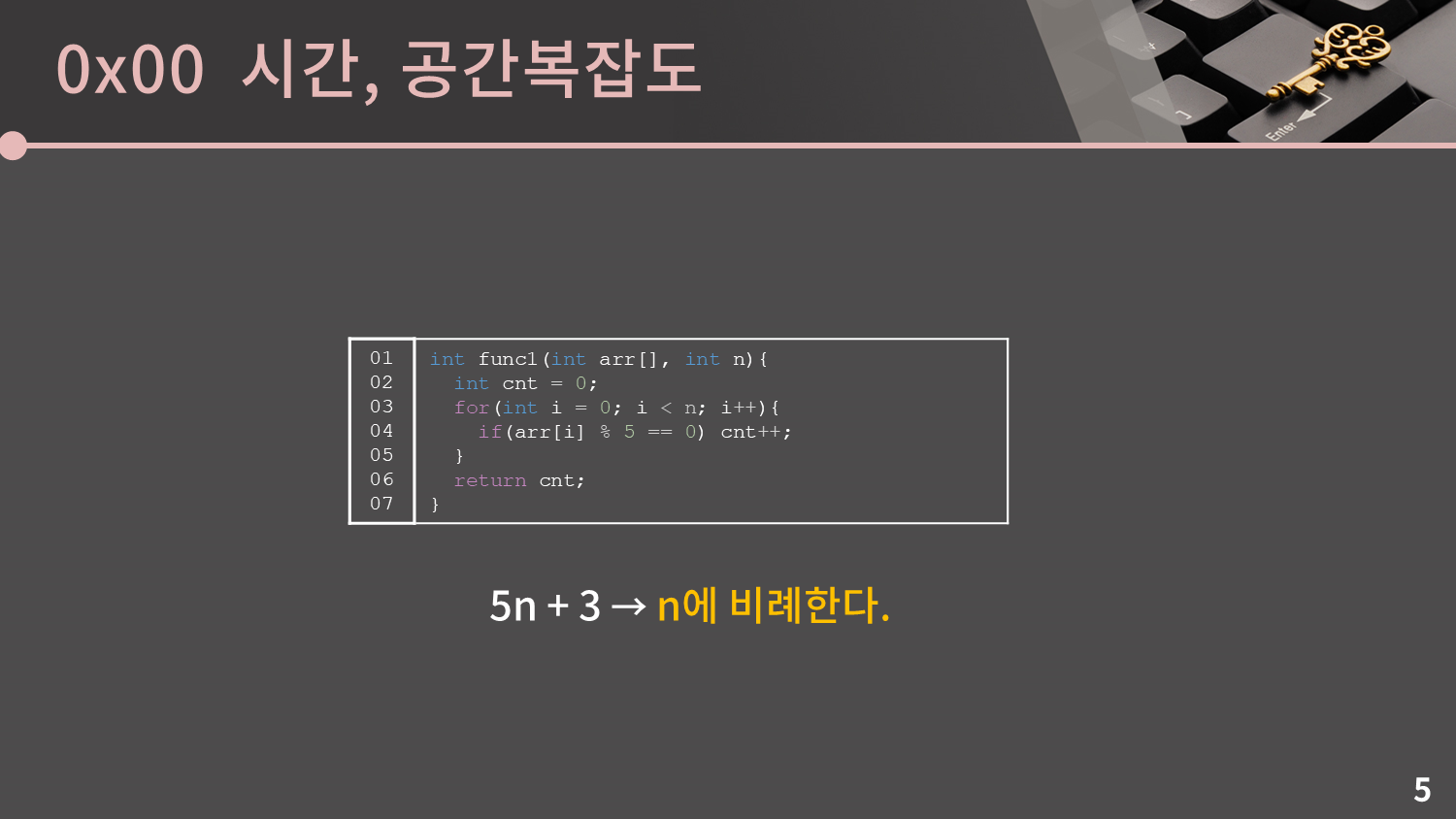 이 사실을 어떻게 빠르게 캐치할 수 있냐면 결국 이 코드는 n개의 수를 훑어보며 5로 나눈 나머지를 계산해보게 됩니다. 그러면 03, 04, 05번째 줄의 for문에서 n번에 걸쳐 5로 나눈 나머지를 확인하고 0과 일치하면 cnt를 증가시키는 행위를 하게 되니 굳이 아까처럼 하나하나 뜯어보며 5n + 3이라는 것을 알아내지 않더라도 n에 비례하겠거니 하고 충분히 생각할 수 있습니다.