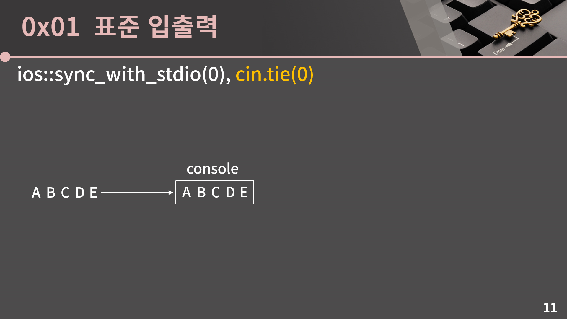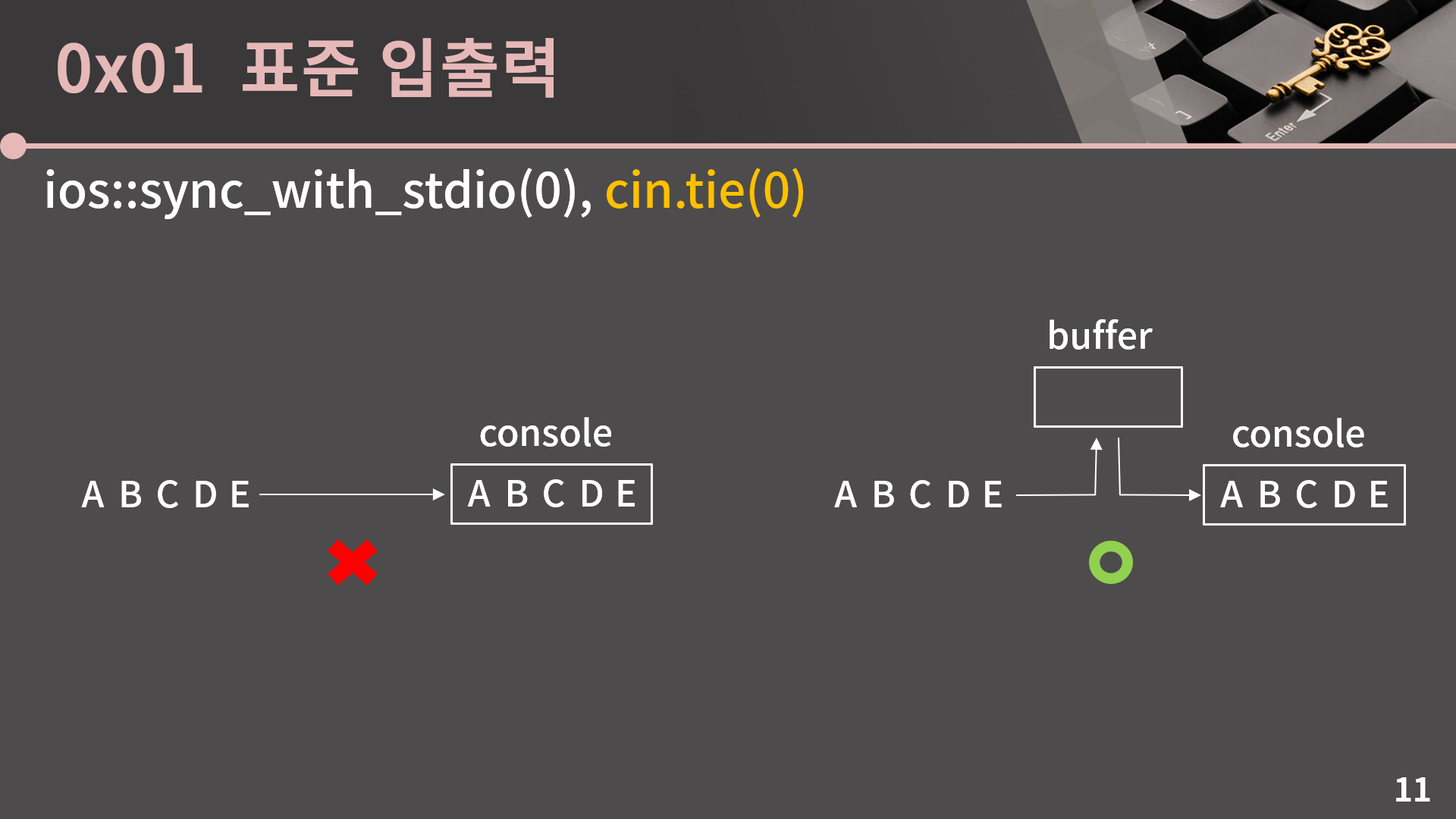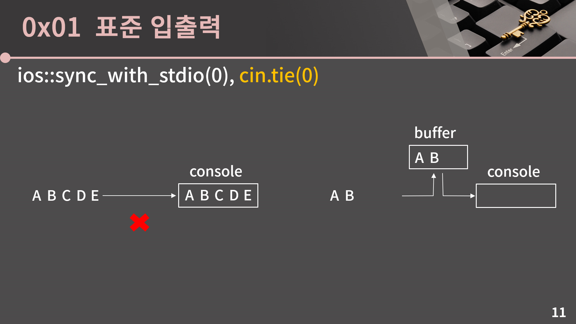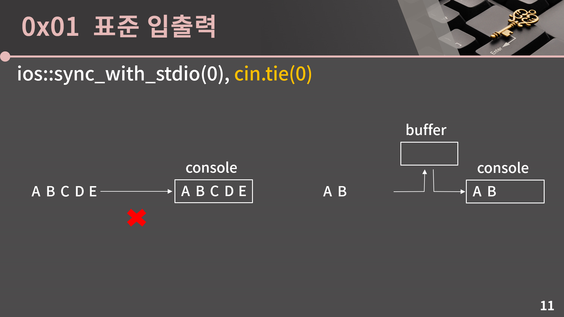 두 번째 명령인 cin.tie(0)을 이해하려면 버퍼라는 개념을 이해해야 합니다. 그런데 버퍼가 각 잡고 강의하면 거의 30분은 들여서 설명해야 할 개념이어서 아쉽지만 좀 간략하고 두리뭉실하게 설명을 해야할 것 같습니다.