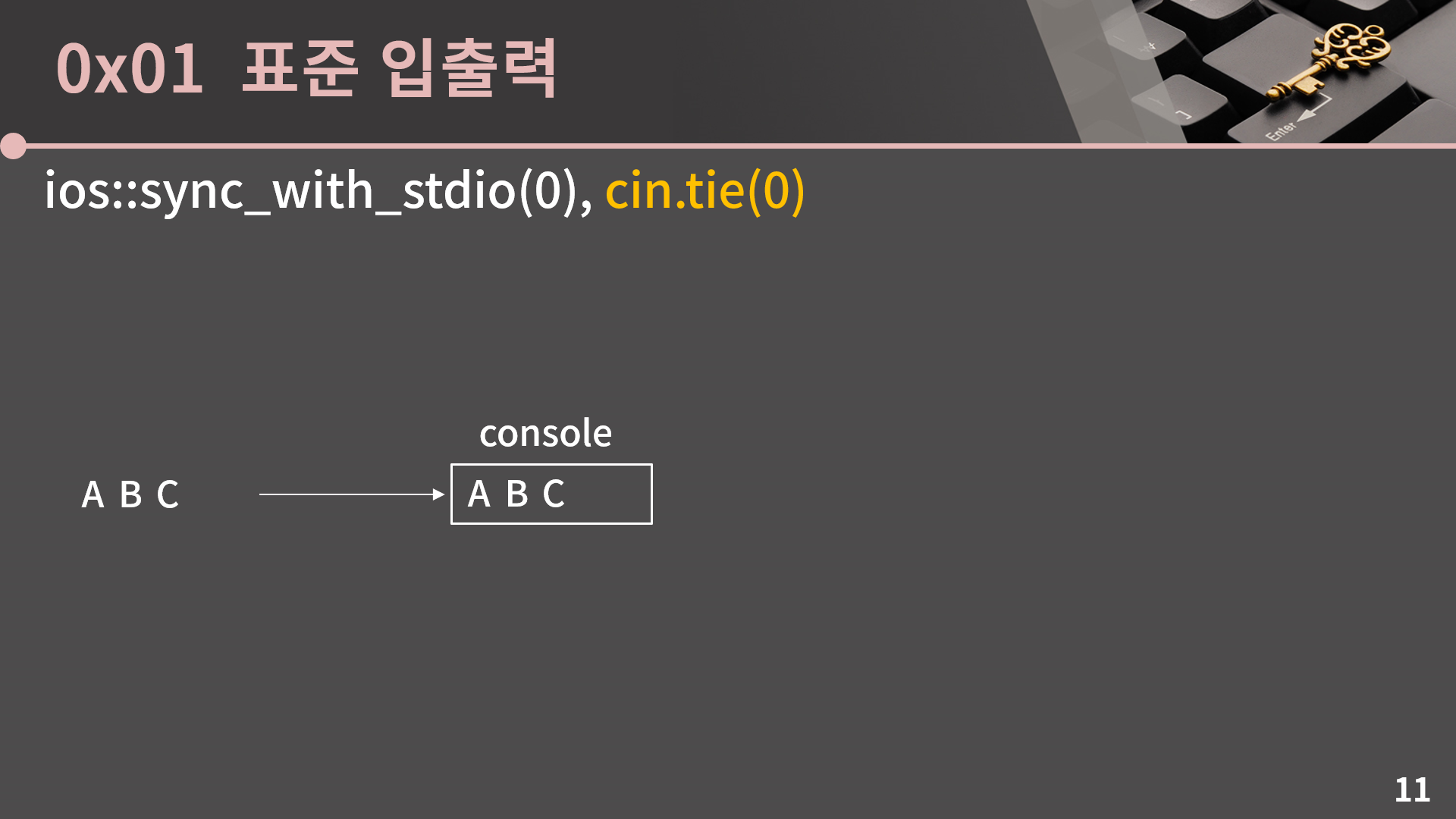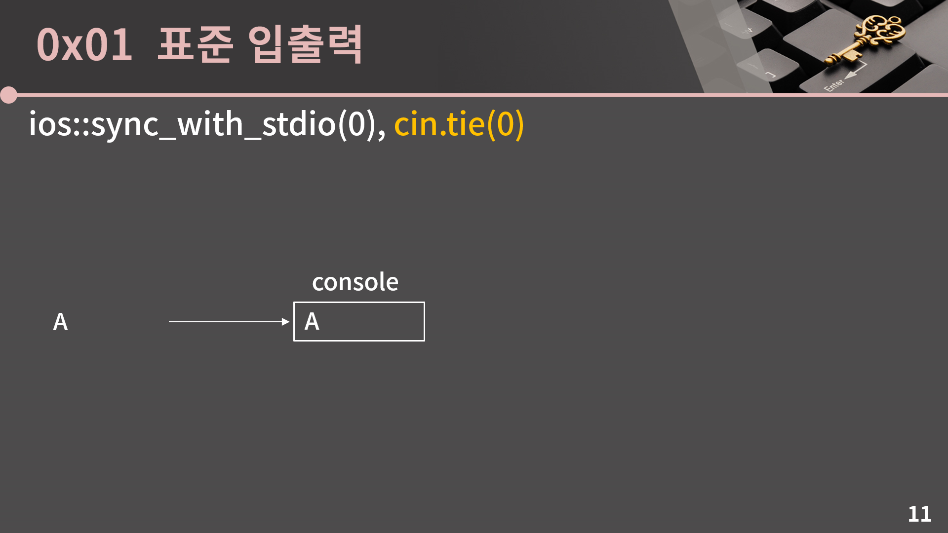 그렇기 때문에 C++ stream만 쓸거면 동기화를 끊어버려서 프로그램 수행 시간에서 이득을 챙길 수 있고, 동기화를 끊는 명령이 sync_with_stdio(0)입니다. 엄밀히 말해 인자가 bool type이라 sync_with_stdio(false)가 더 맞긴 한데 false보다 0이 더 짧으니 그냥 0으로 하겠습니다.