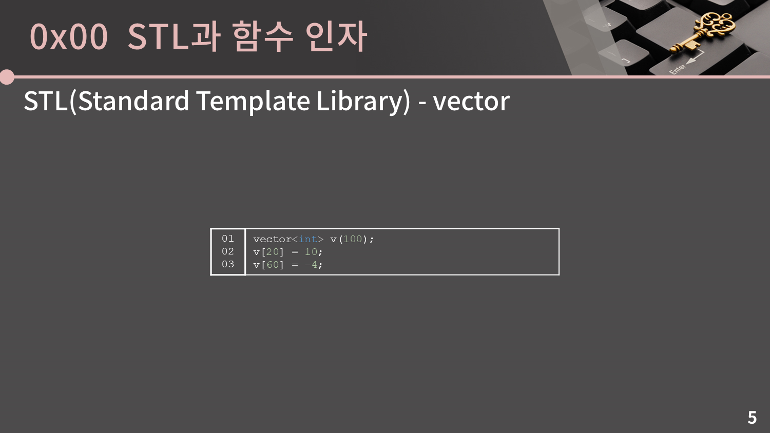 원래 C++에서는 배열을 선언할 때 크기를 명시해야 하고 무조건 해당 크기 안에서만 사용을 해야 합니다. 그런데 vector는 일종의 가변배열로 크기를 마음대로 늘렸다 줄였다 할 수 있습니다. 자세한 기능은 0x03강에서 알려드릴거고 지금은 간단하게만 익혀보겠습니다. 참고로 vector는 vector 헤더에 선언되어있습니다.