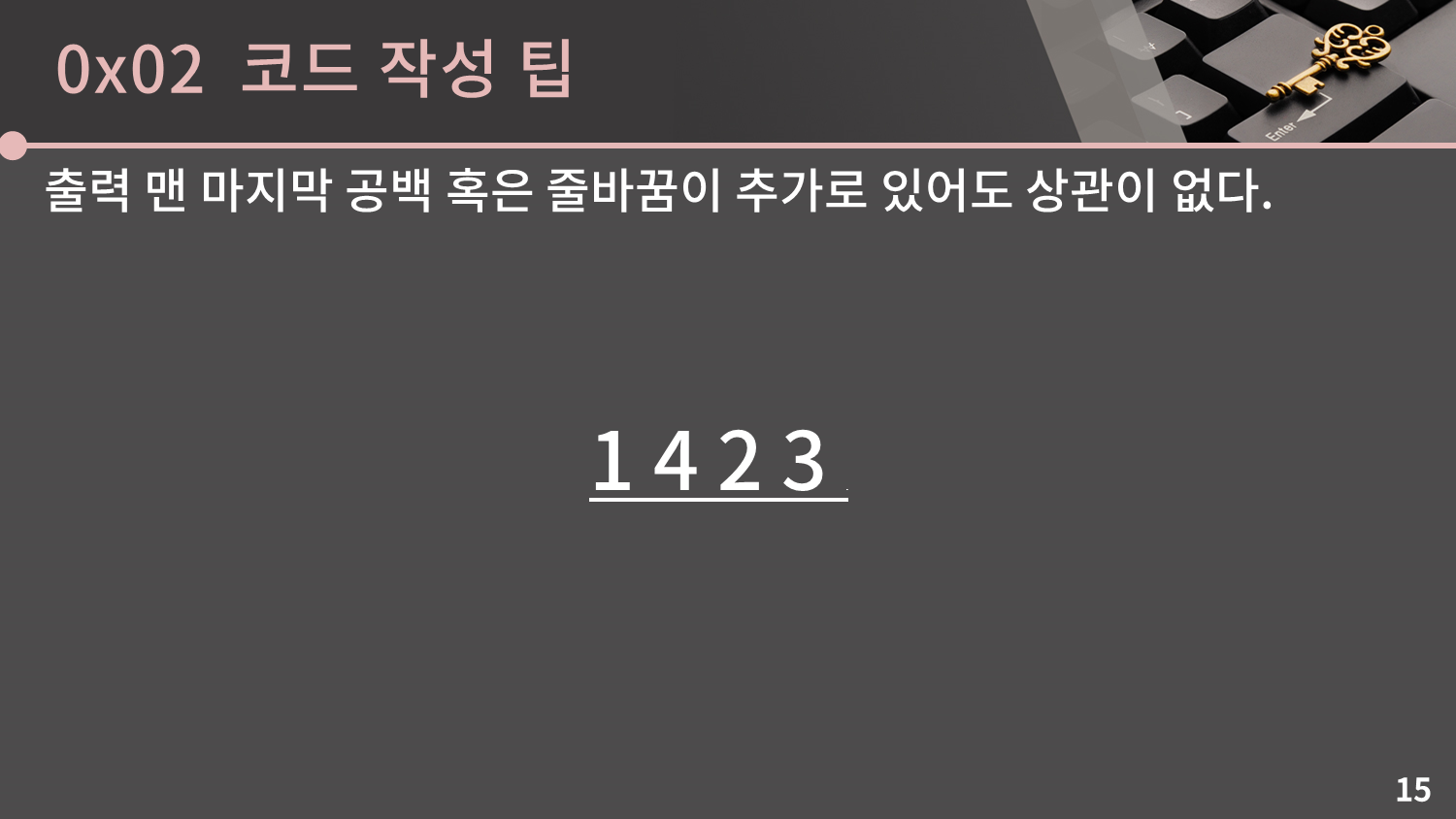그리고 이건 굉장히 구체적인 팁인데 출력 맨 마지막에 공백 혹은 줄바꿈이 추가로 있어도 상관이 없습니다. 당장 앞의 문제도 엄밀하게 말을 하면 답이 1 4 2 3일 때 3 다음에 공백 1개가 추가로 출력되었습니다. 그래도 아무 문제 없이 정답 처리가 됐습니다.