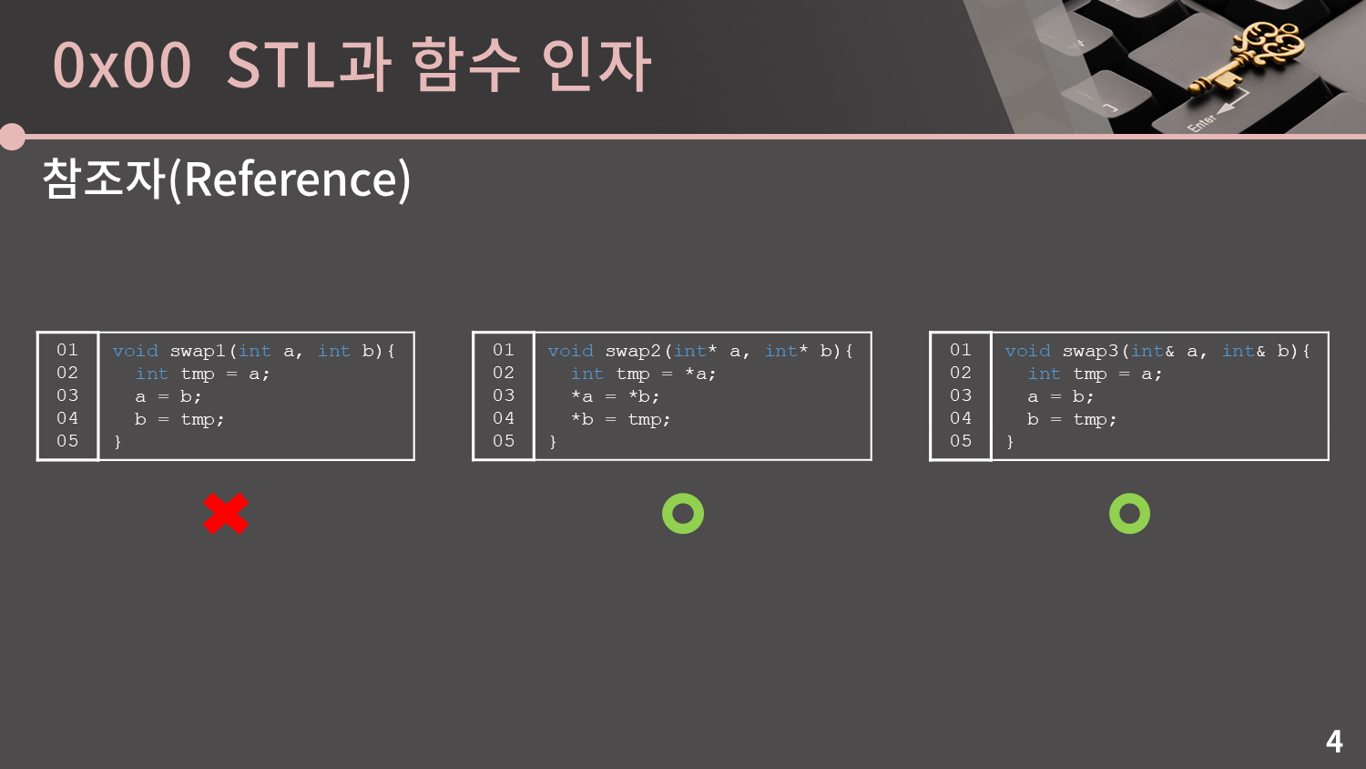 저렇게 a와 b를 참조자로 만들면 함수 내의 코드에서는 그냥 int를 쓰듯이 tmp에 a를 대입하고, a에 b를 대입하고 하는데 저게 다 원본을 바꾸는 것입니다.