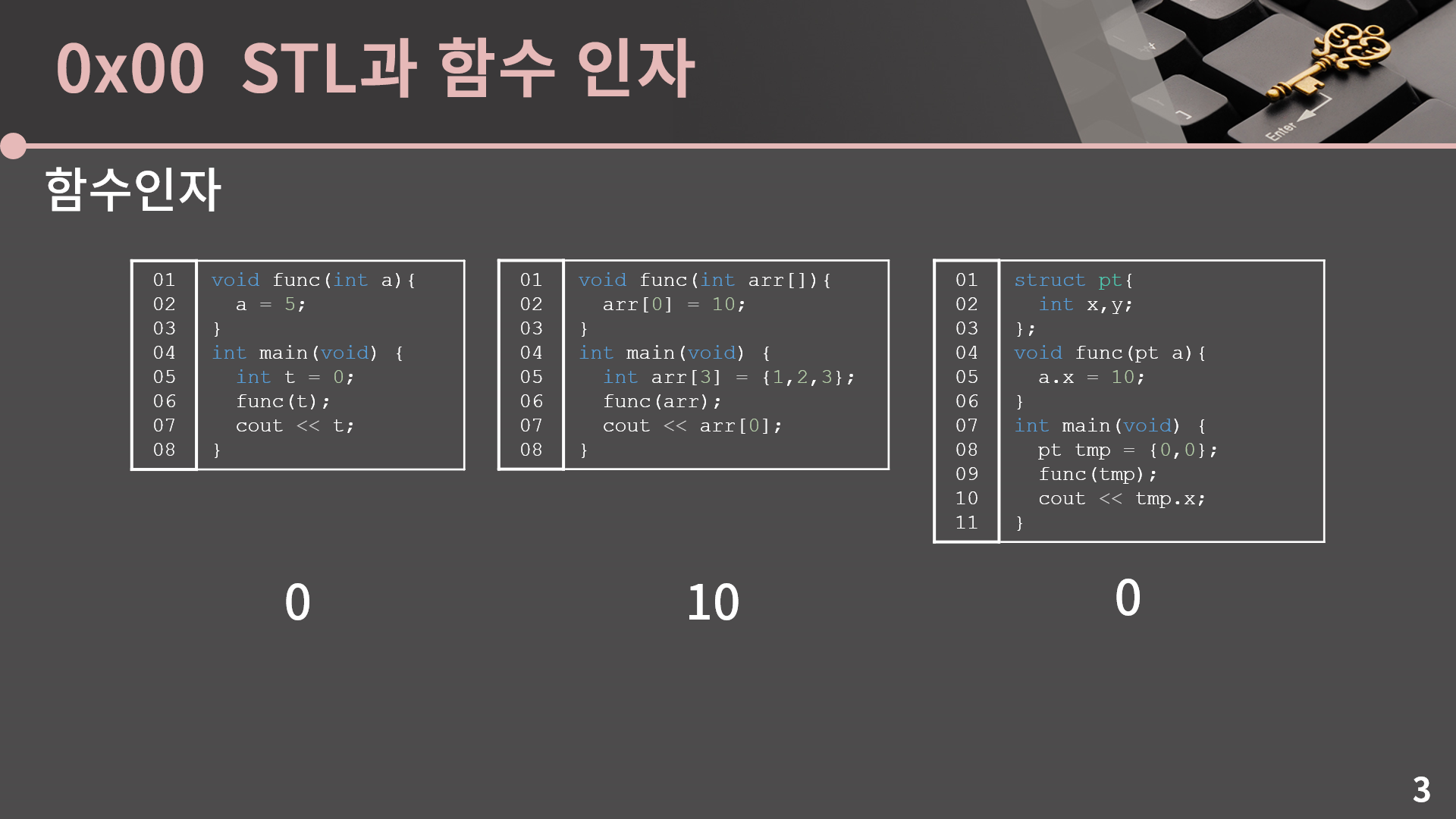 답은 바로 0, 10, 0입니다. 세 번째 코드는 헷갈렸을 수도 있을 것 같은데 첫 번째나 두 번째에서 틀리셨다면 좀 맴찢이네요ㅜㅜ