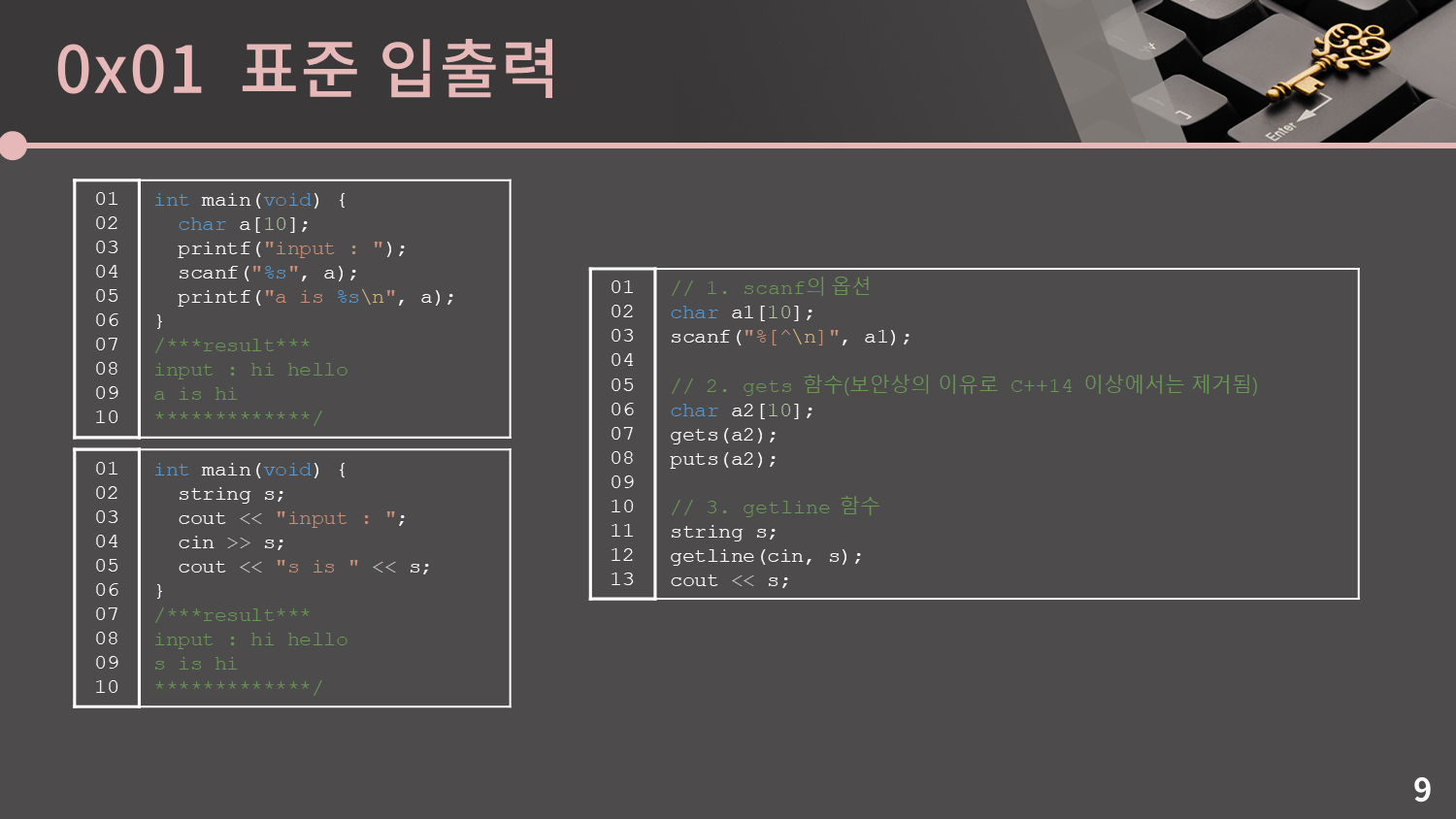 두 번째는 gets 함수를 사용하는건데, 문제는 저 함수가 보안상의 이유로 C++14 이상에서는 제거되었습니다. 그래서 이것도 별로입니다.