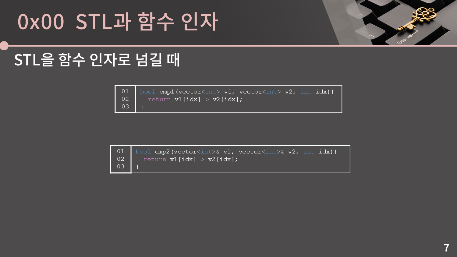 그냥 STL을 쌩으로 함수 인자에 넣으면 복사해서 보낸다는걸 꼭 유의하셔야 합니다. 이 사실을 머릿속에 넣어두고 cmp1 함수를 한 번 확인해봅시다.