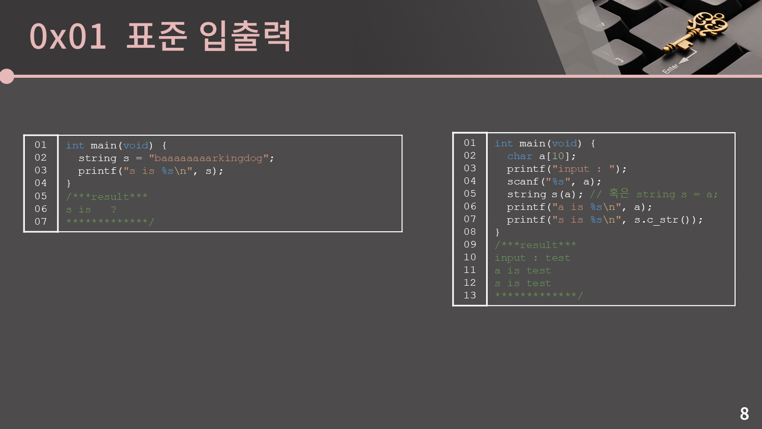 scanf/printf에서 단 한 가지 아쉬운 점이라고 한다면, C++ string을 처리할 수가 없습니다. 아시다시피 C에서는 char*으로 문자열을 다루는데 사실 char*보다 C++ string이 월등하게 편합니다. 그래서 scanf/printf를 쓰면서도 C++ string을 활용하고 싶으면 일단 char*으로 입력을 받고 string으로 형 변환을 해서 원하는 작업을 다 끝낸 후에 c_str() 메소드를 이용해 출력하면 됩니다. 코드를 한 번 확인해보세요.