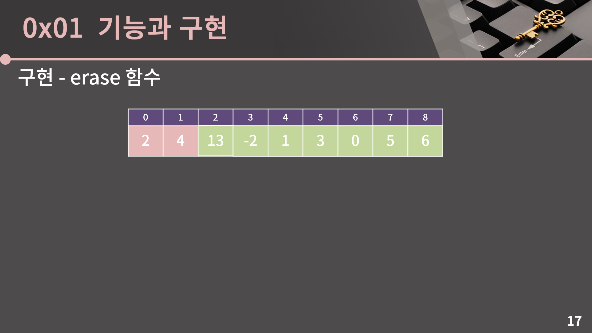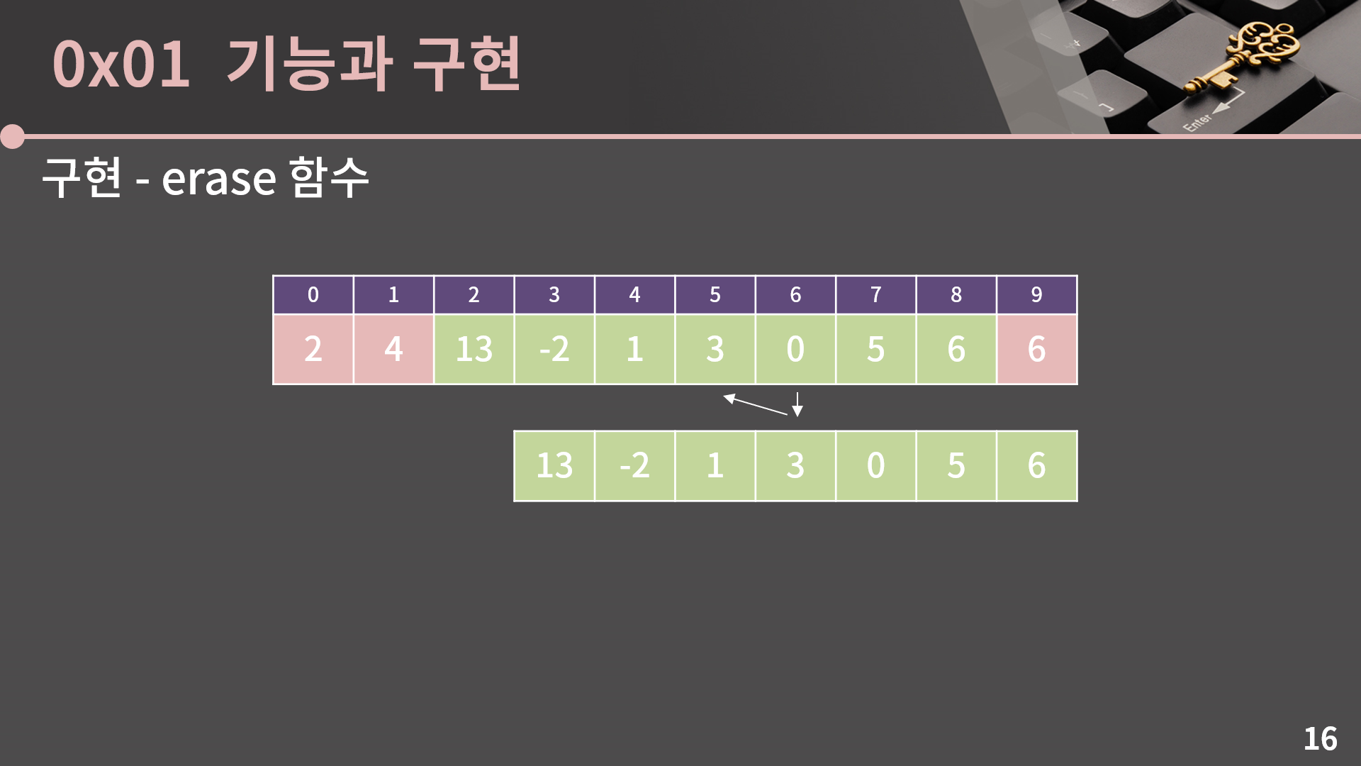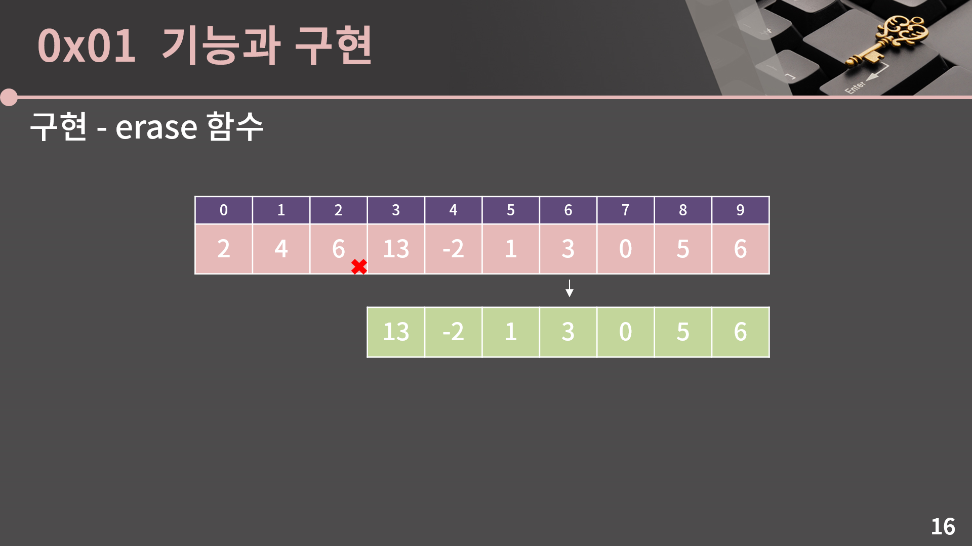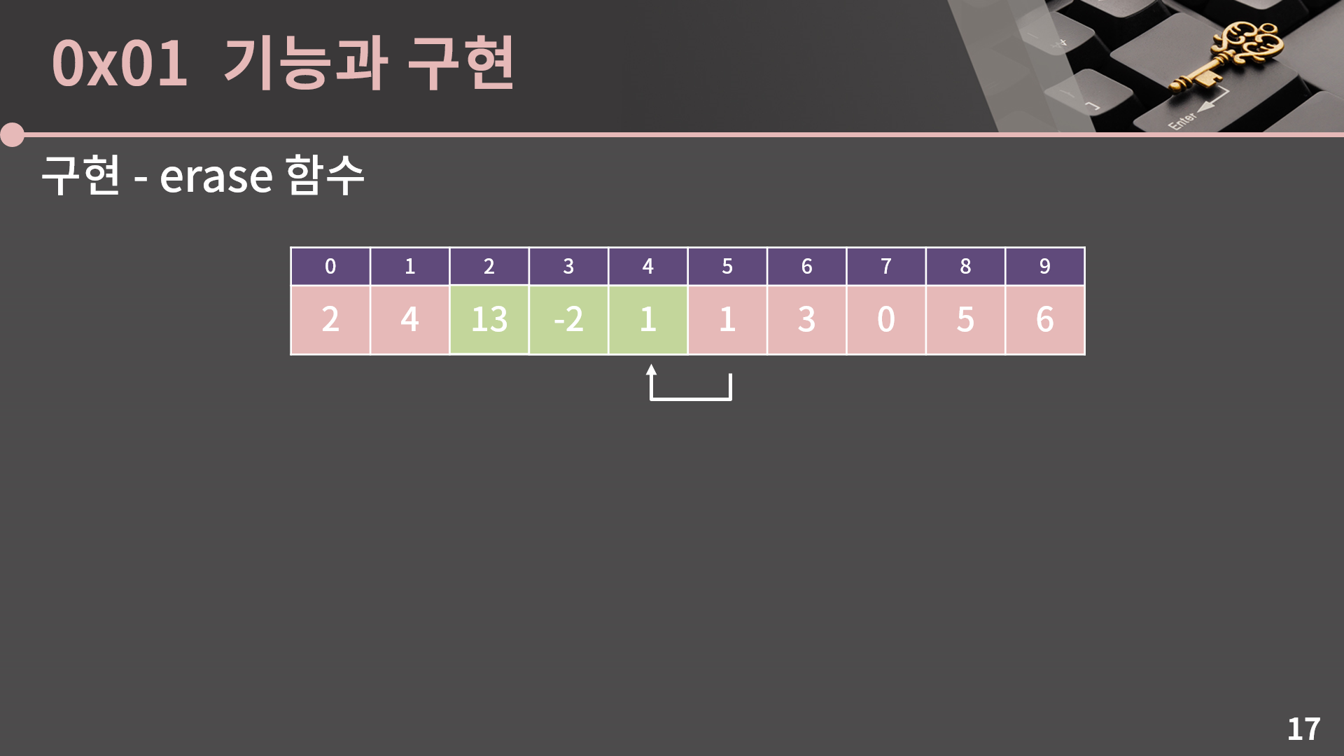 그 다음으로는 erase 함수를 구현해보겠습니다. 예를 들어 2번째 원소를 지우고 싶으면 이번에는 3번째부터 9번째까지의 원소들을 왼쪽으로 한 칸씩 밀면 됩니다.