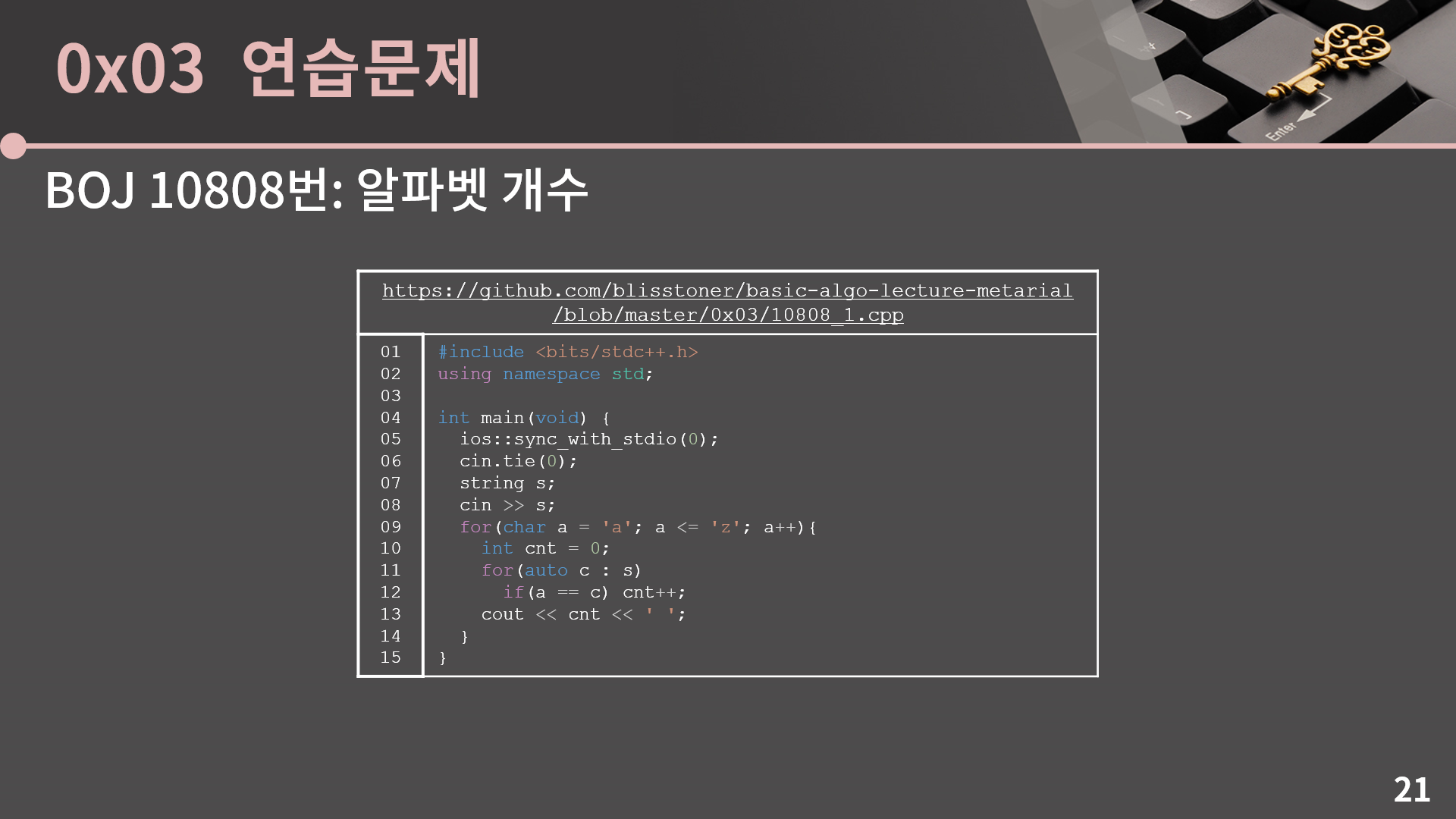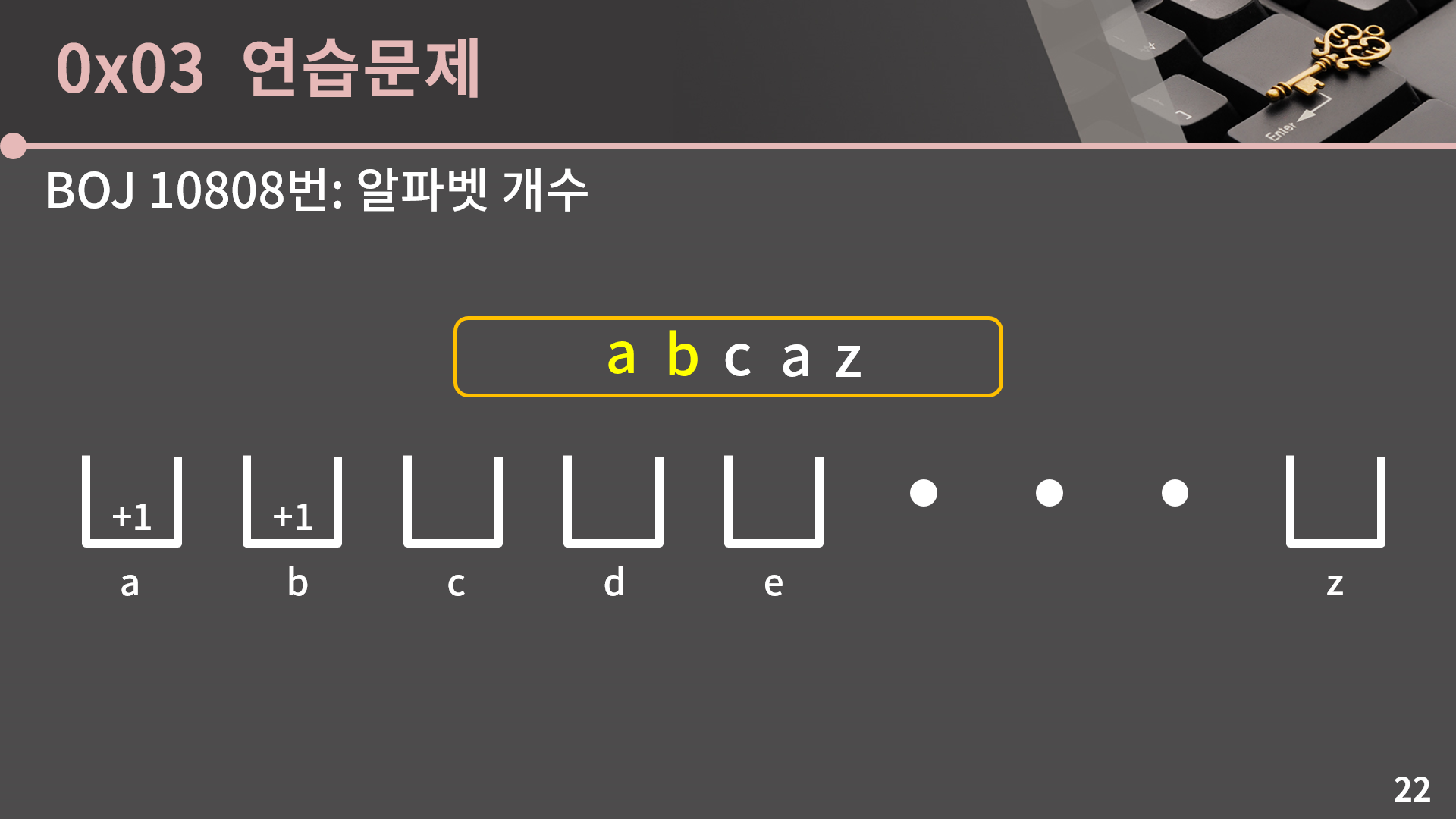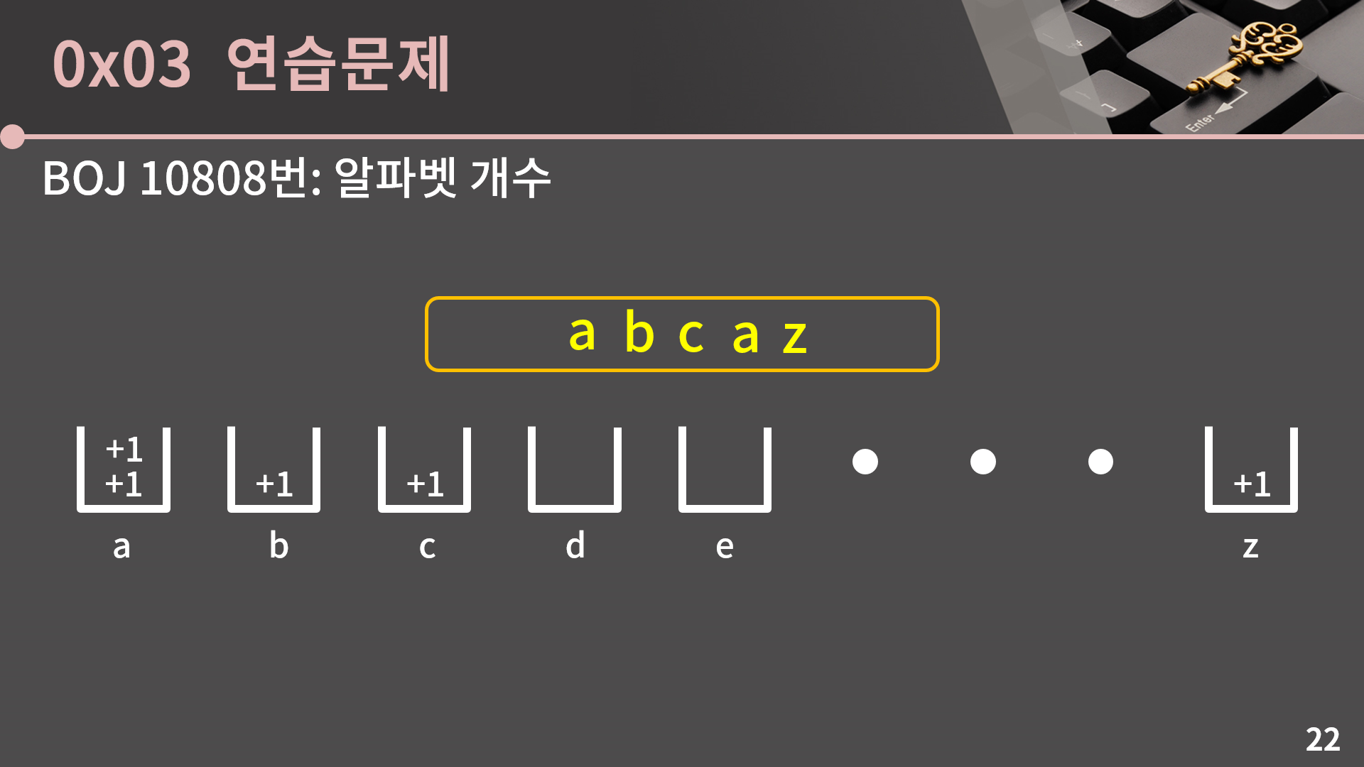 아무튼 s를 입력받은 후 freq[c-'a']++;을 통해 마치 이전 슬라이드에서 본 것 처럼 그릇에 1을 더해줍니다. c-'a'를 해줌으로서 c가 'a'였다면 0, 'b'였다면 1, ···,  'z'였다면 25가 됩니다. 이 부분이 조금 낯설다 싶으시면 아스키코드를 한 번 찾아보세요.