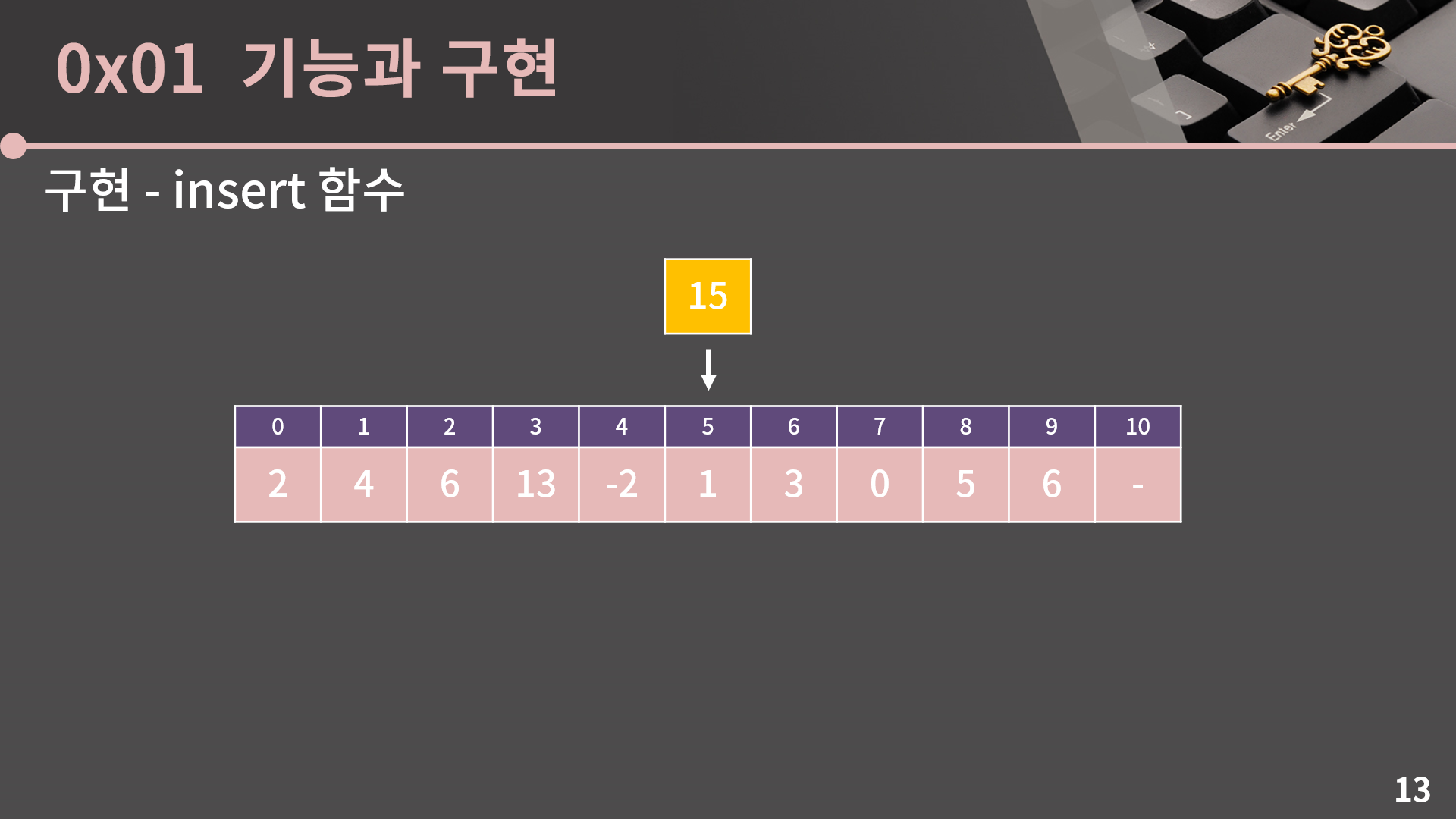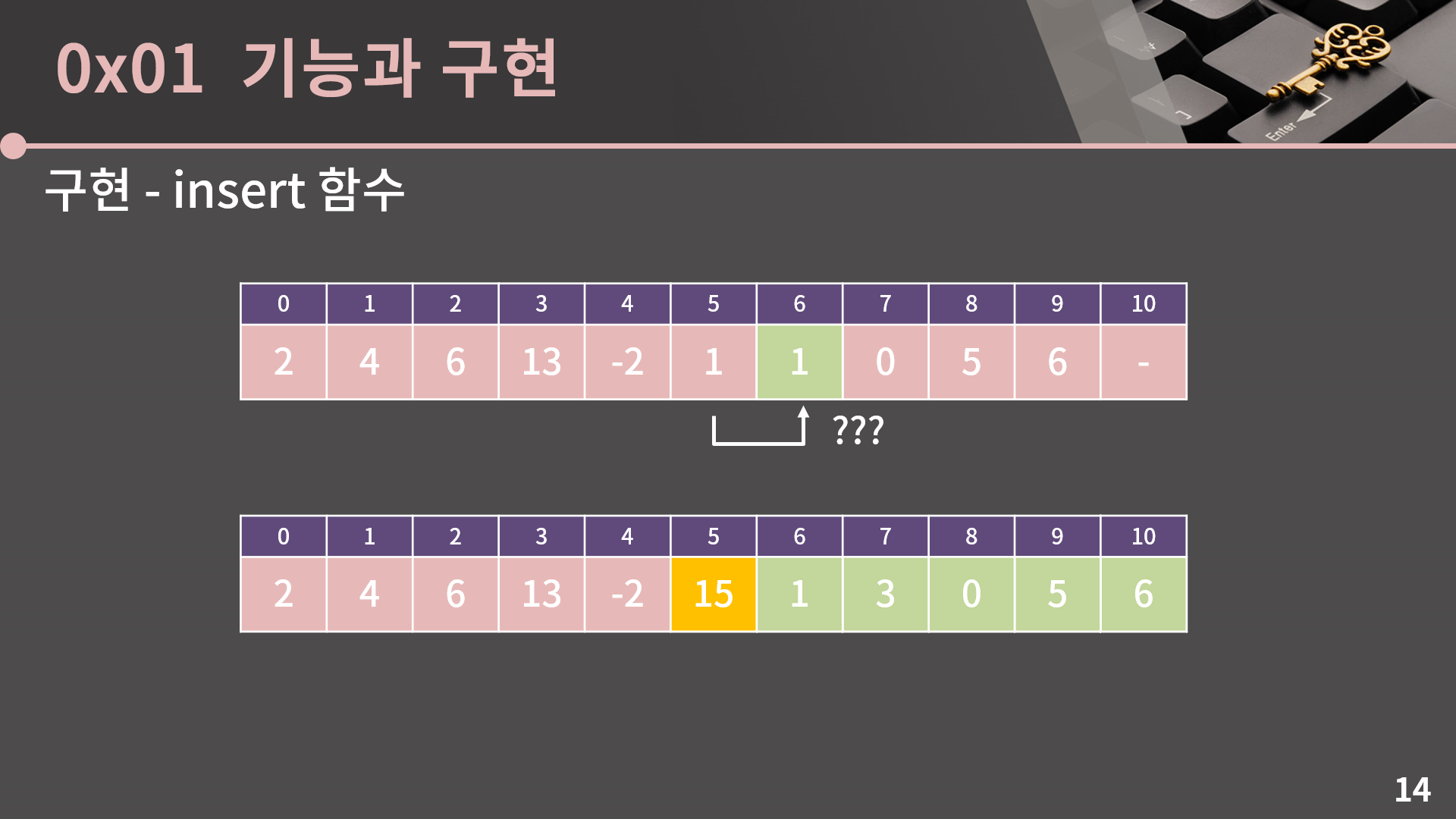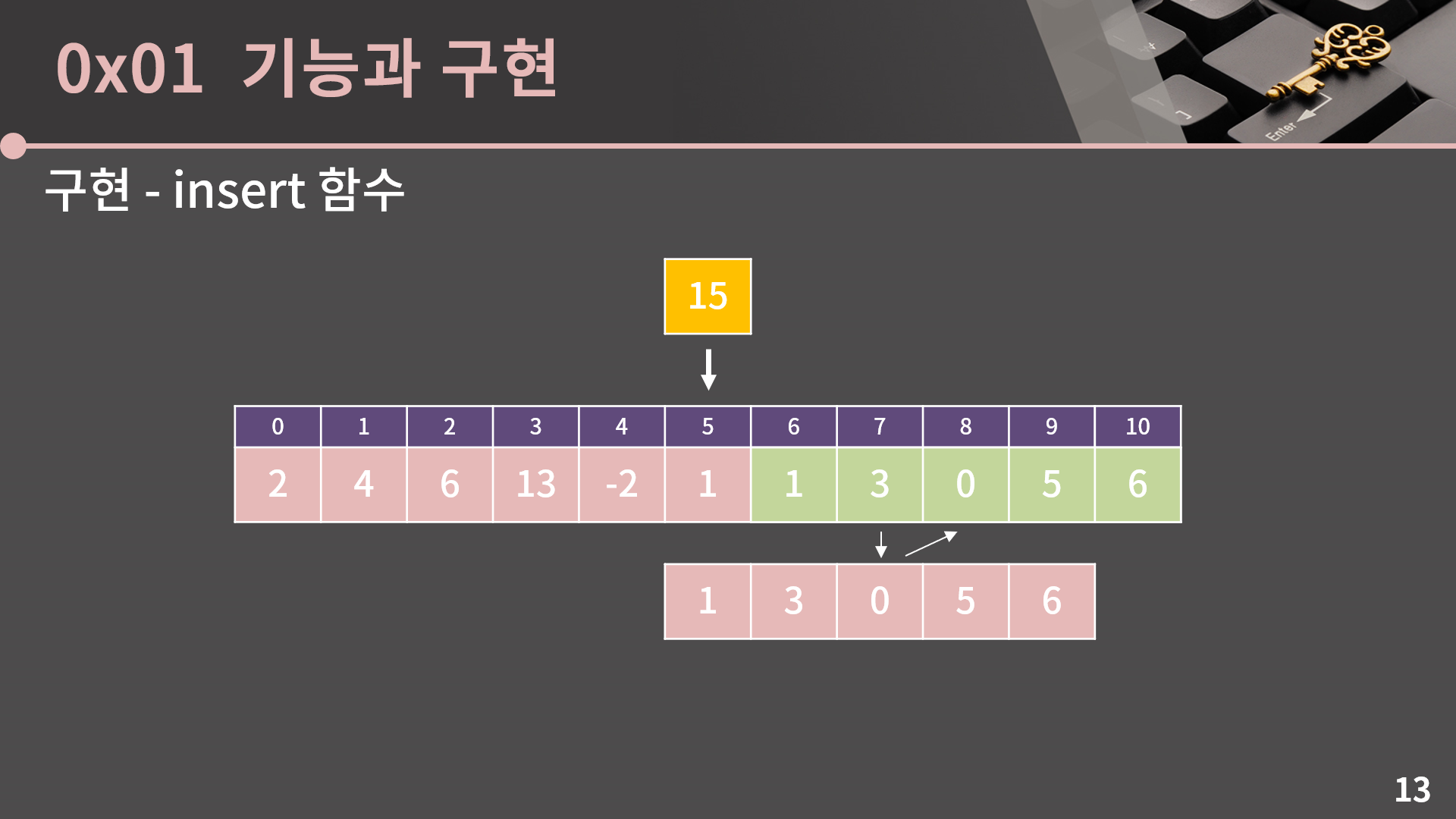 일단 insert 함수부터 살펴보면, 5번째에 15를 넣고싶다고 할 때 1, 3, 0, 5, 6을 오른쪽으로 한 칸씩 밀어서 자리를 만들어줘야 합니다. 그래야 15가 제 자리에 들어갈 수 있기 때문입니다.