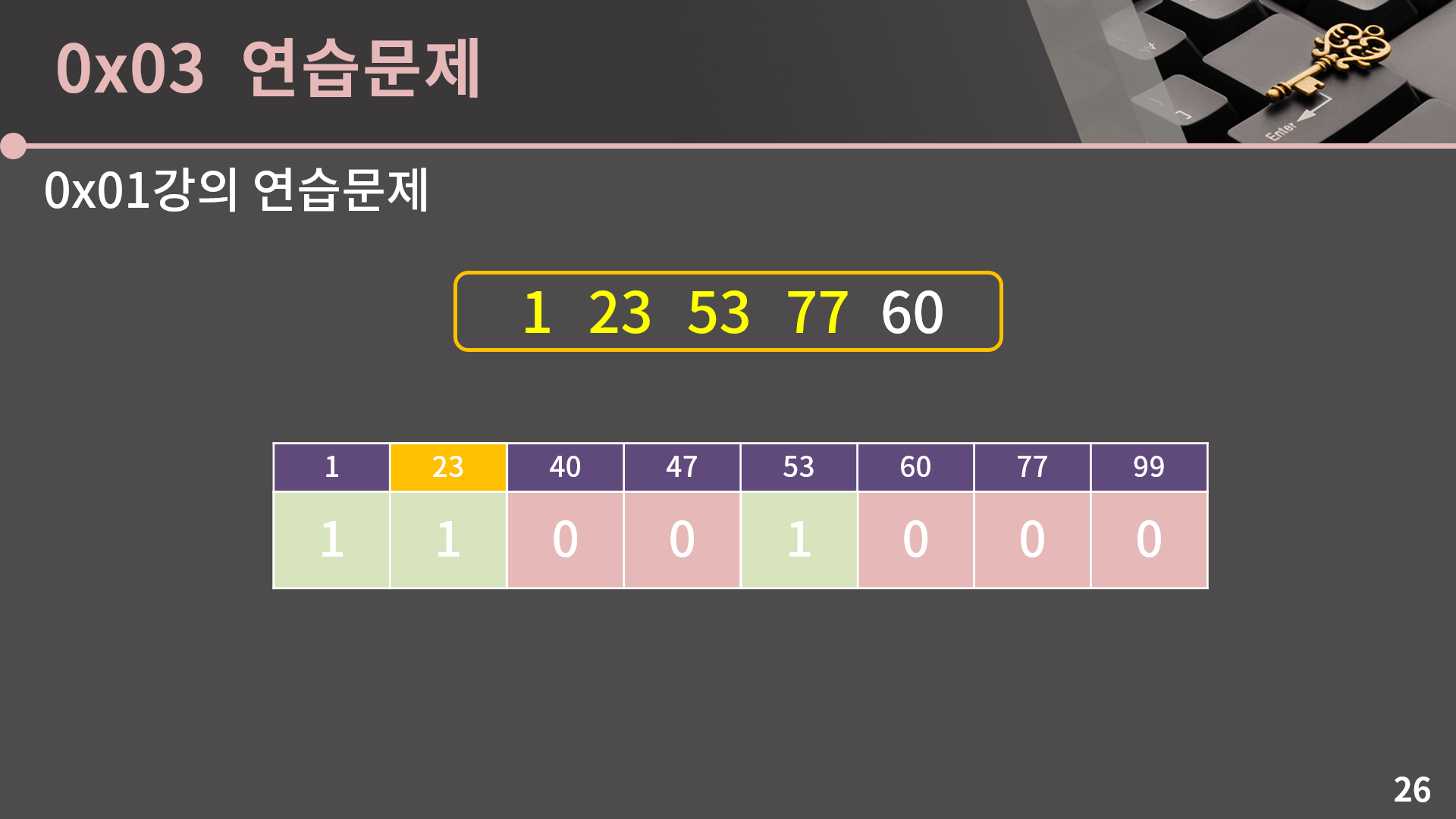 그 다음으로는 23입니다. 일단 77이 이전에 등장했는지를 확인해보면 77번 인덱스의 값은 0이니 77은 이전에 등장한 적이 없습니다. 이후 23번 인덱스의 값을 0에서 1로 변경합니다.
