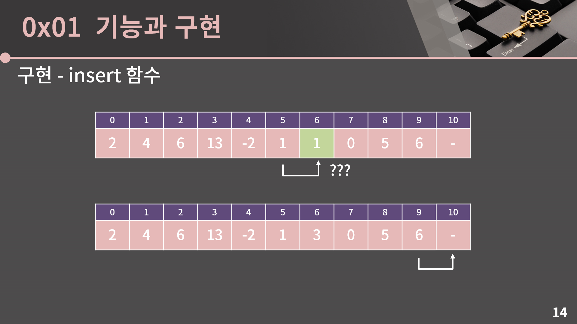 예를 들어 {10, 50, 40, 30, 70, 20}에서 3번째에 60을 넣는다면 30, 70, 20이 한 칸씩 뒤로 밀려서 {10, 50, 40, 60, 30, 70, 20}이 되는 것입니다. 그리고 이 때 len은 참조자로 보냈으니 insert 함수에서 len 값을 바꾸면 원본의 값이 바뀝니다.