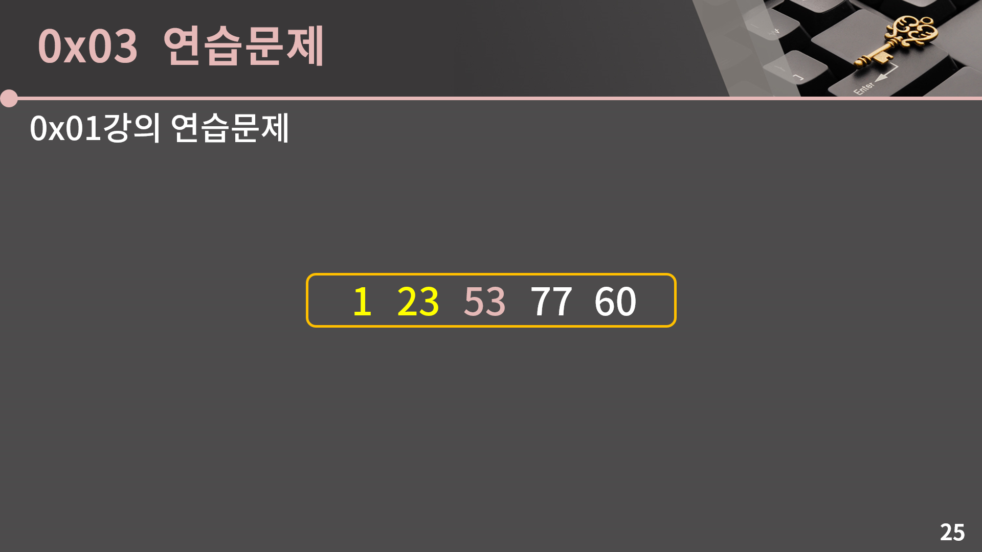 배열 강의는 여기까지입니다. 다른 내용은 크게 어렵지 않은데 연습문제로 다룬 내용은 아마 낯설 수도 있을 것 같습니다.