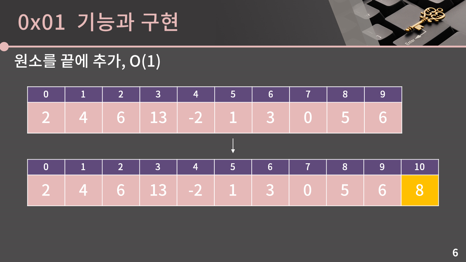 그 다음으로는 원소를 끝에 추가하는 연산인데, 이것도 그냥 끝자리에 값을 쓰고 길이를 1 증가시키면 되니 O(1)입니다.