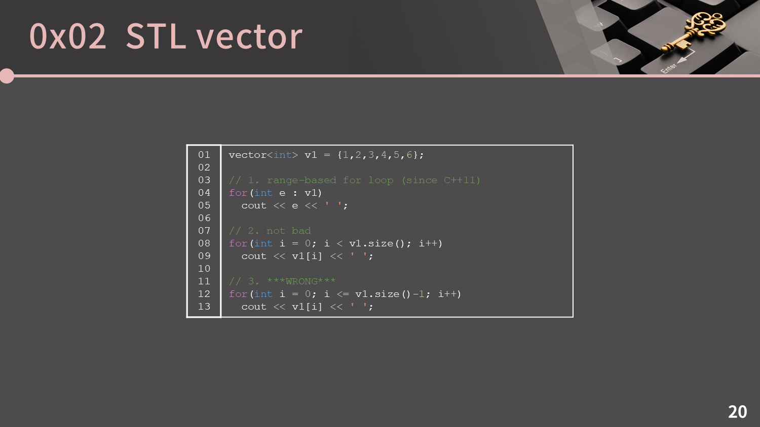 range-based for loop가 그다지 익숙하지 않다면 아주 무난하게 for문으로 인덱스를 하나씩 다 돌아도 상관없습니다. 2번과 3번이 전부 그렇게 처리하는 코드인데 사실 3번처럼 쓰면 아주 잘못될 수 있습니다.