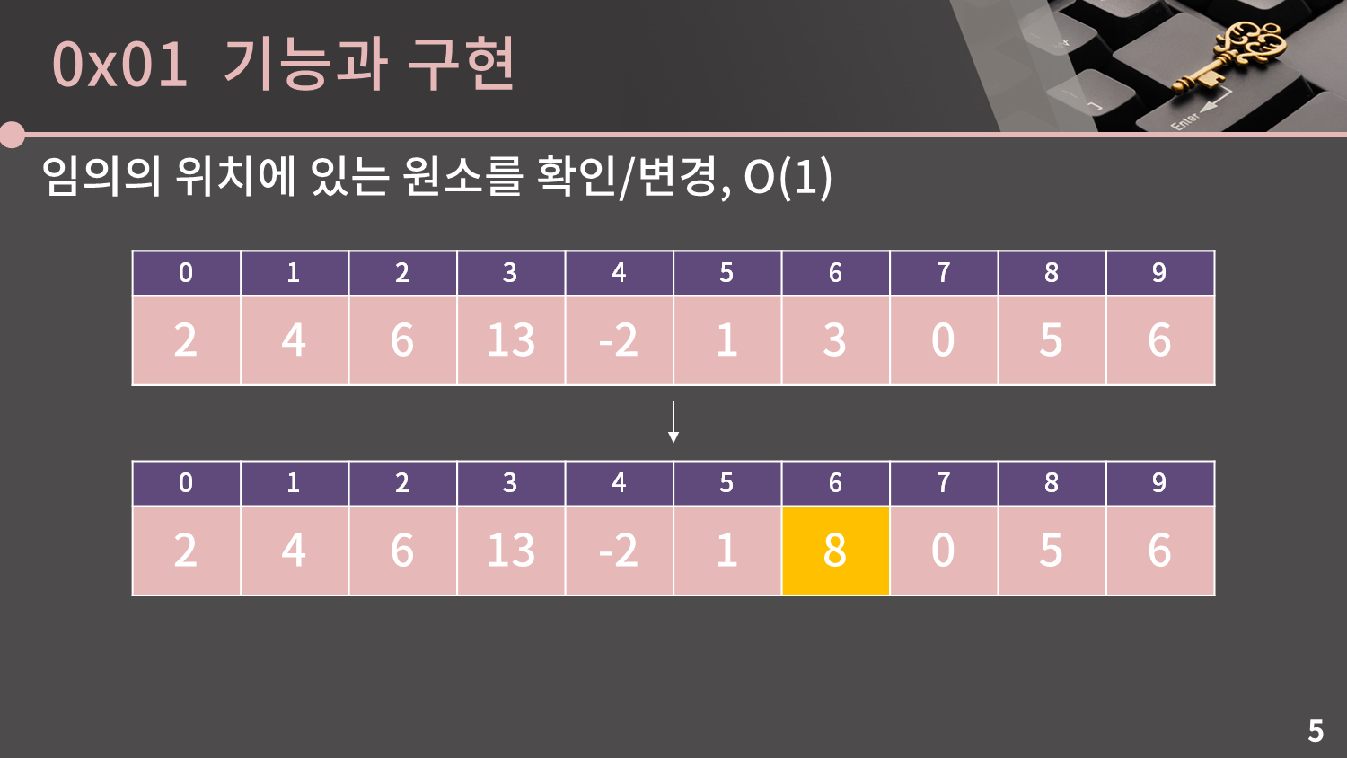 이제 배열에서 제공되는 연산들을 하나씩 살펴보겠습니다. 첫 번째로 임의의 위치에 있는 원소를 확인하고 변경하는 연산인데, 이건 너무 자명하게 O(1)입니다.